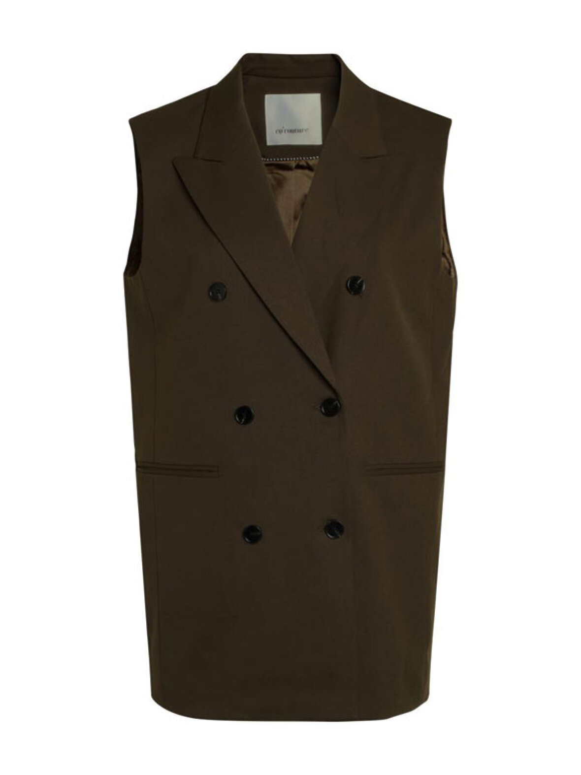 Smuk mørkebrun oversize vest fra Co couture. Vesten har en løs pasform og går ned til/under numsen. Vesten har store knapper forn så man kan knappe en eller lade den stå åben.
