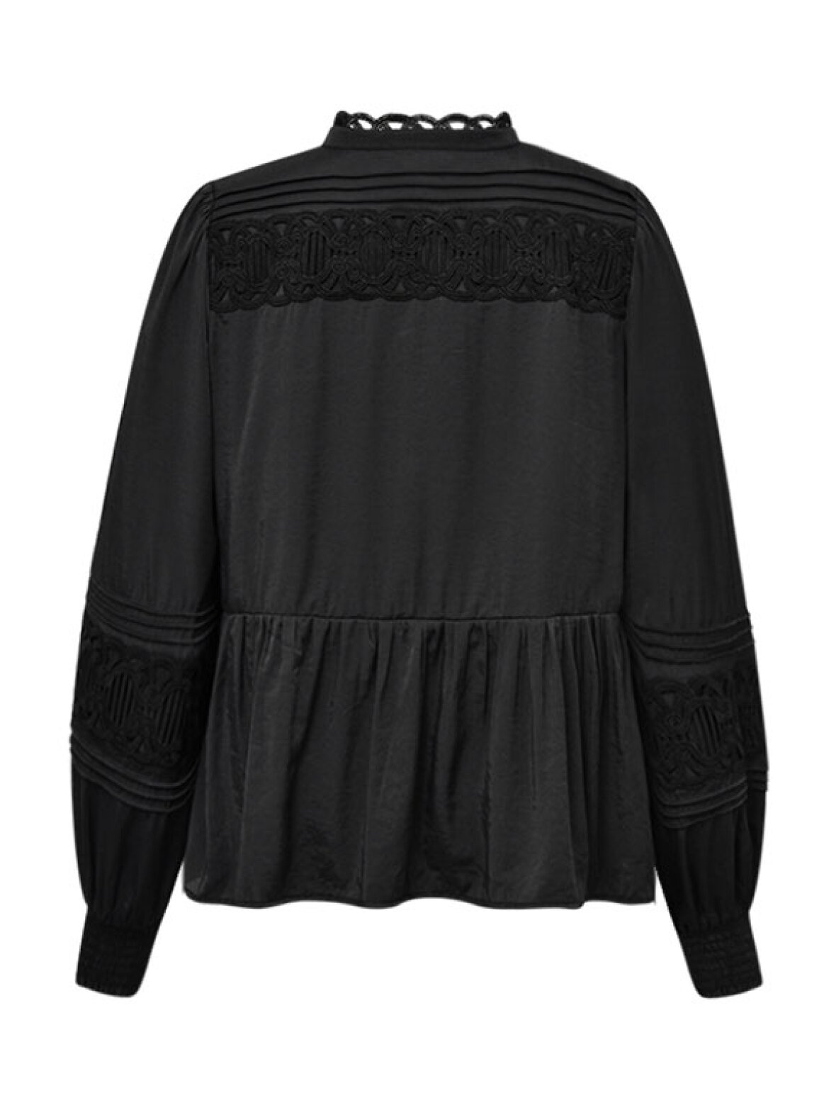 De gør det igen og igen! Gossia har lavet denne fine bluse med så mange fine påsyede blonder. Blusen er med knapper, skæring i talje med rynk, vid ærme med smock i håndledet. Smuk bluse til hverdag med bestemt også til fest.