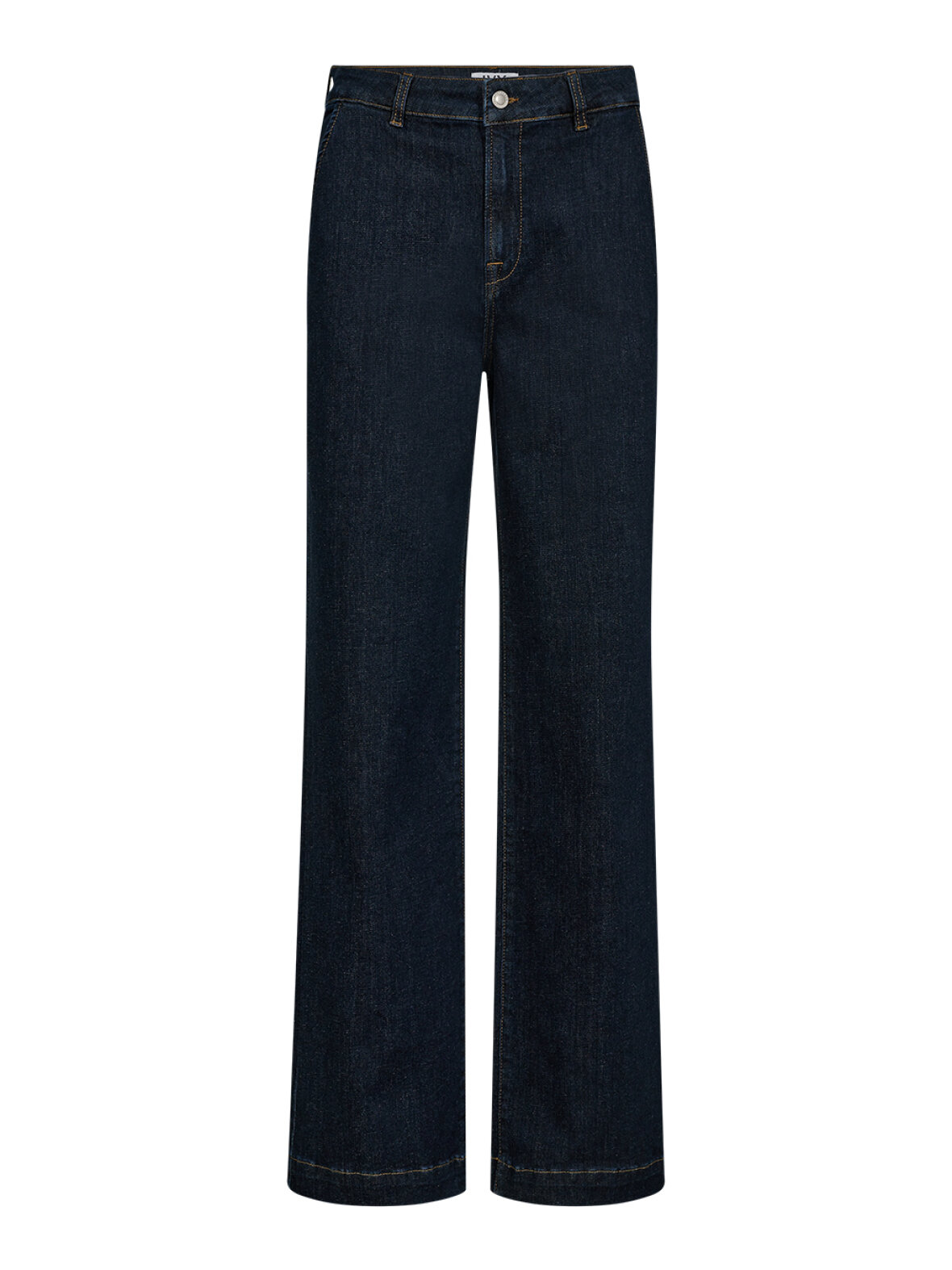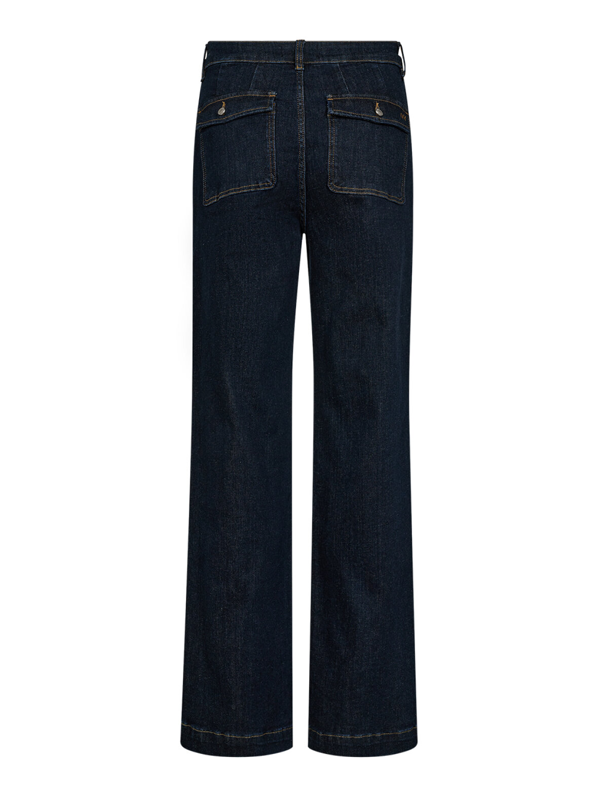 Augusta French jeans fra IVY er et par moderne, klassiske jeans med brede ben og flotte detaljer på baglommerne. De har høj talje, fast linning og lukkes med lynlås og knap. En tidløs denim i mørk blå vask, perfekt til både skjorter og strik.