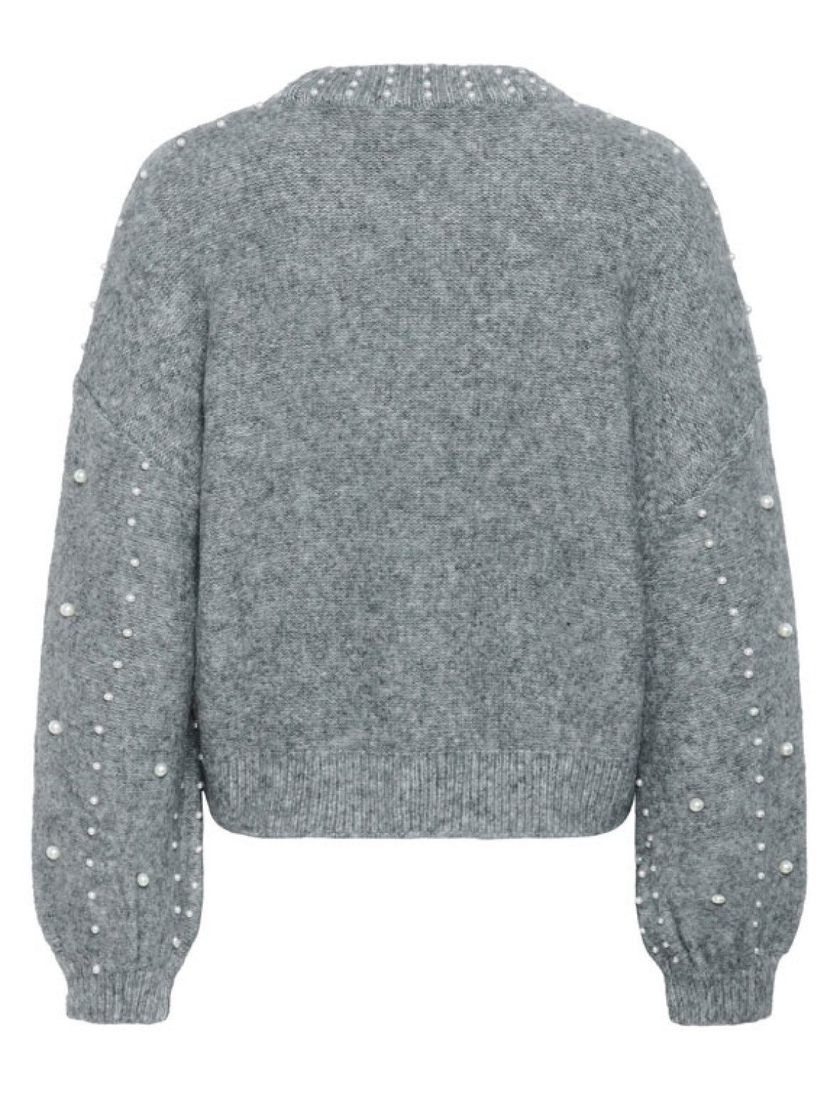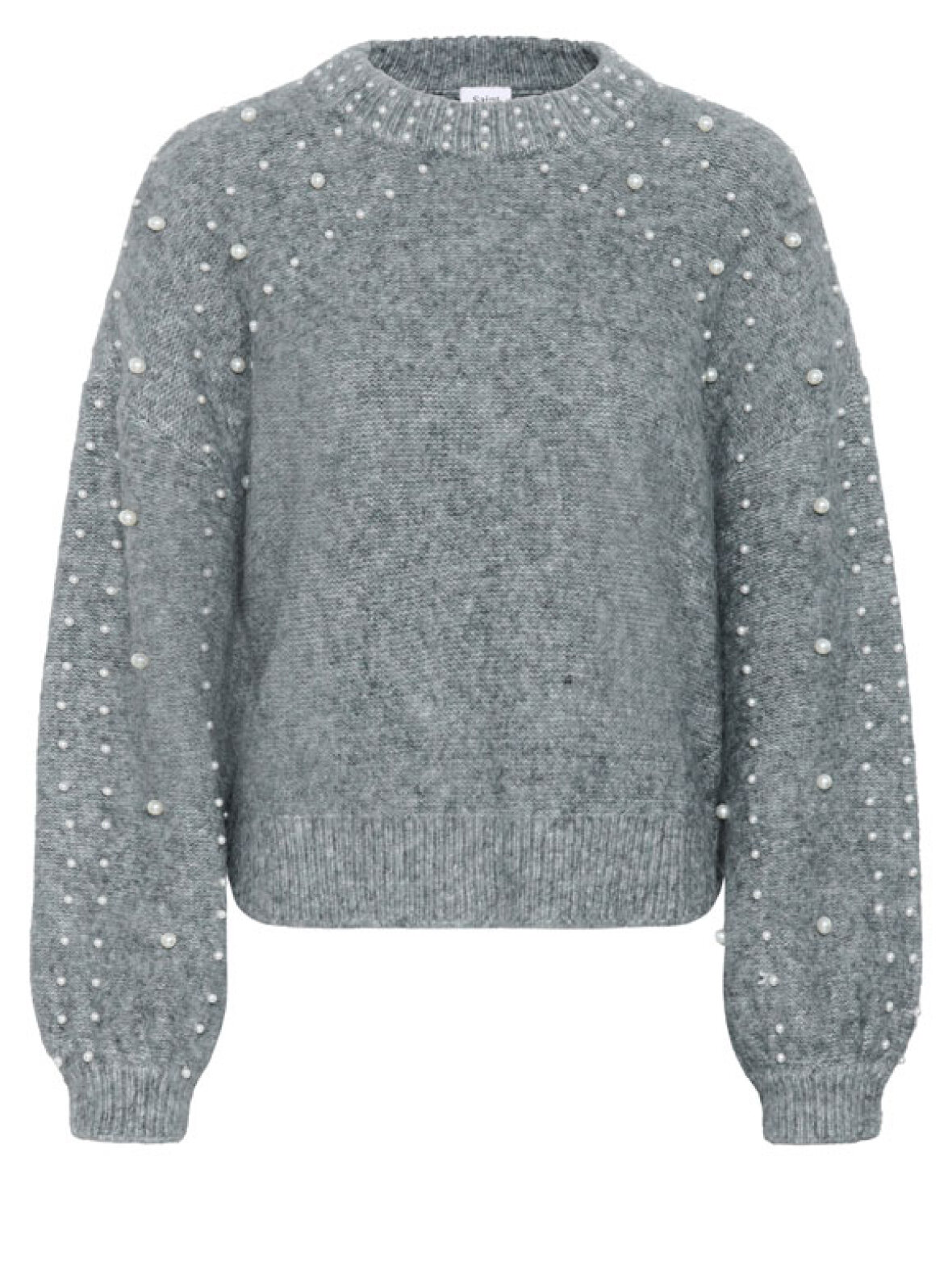 Blød og feminin grå strik fra Saint Tropez med smukke perledetaljer på skuldre og ærmer. Strikken har rund hals, lange ærmer og ribkanter, som giver et klassisk udtryk. Den perfekte kombination af komfort og elegance – ideel til både hverdag og mere festlige anledninger.