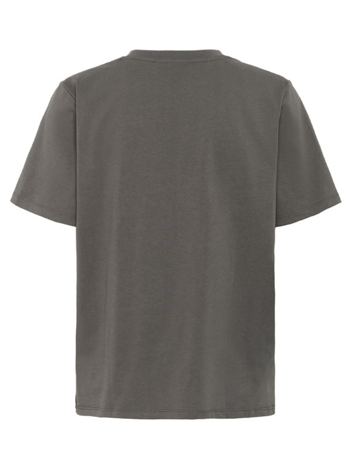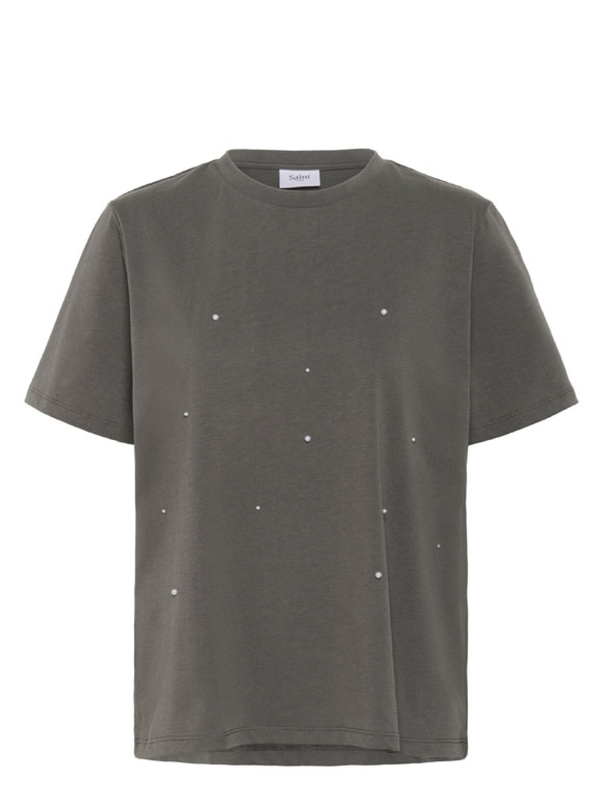 Klassisk grå t-shirt fra Saint Tropez med et moderne twist. Den er fremstillet i 100% bomuld og har små perledetaljer på fronten, som giver et feminint og stilrent udtryk. En perfekt basisstyle, der kan bruges alene eller som lag-på-lag under en blazer eller cardigan.