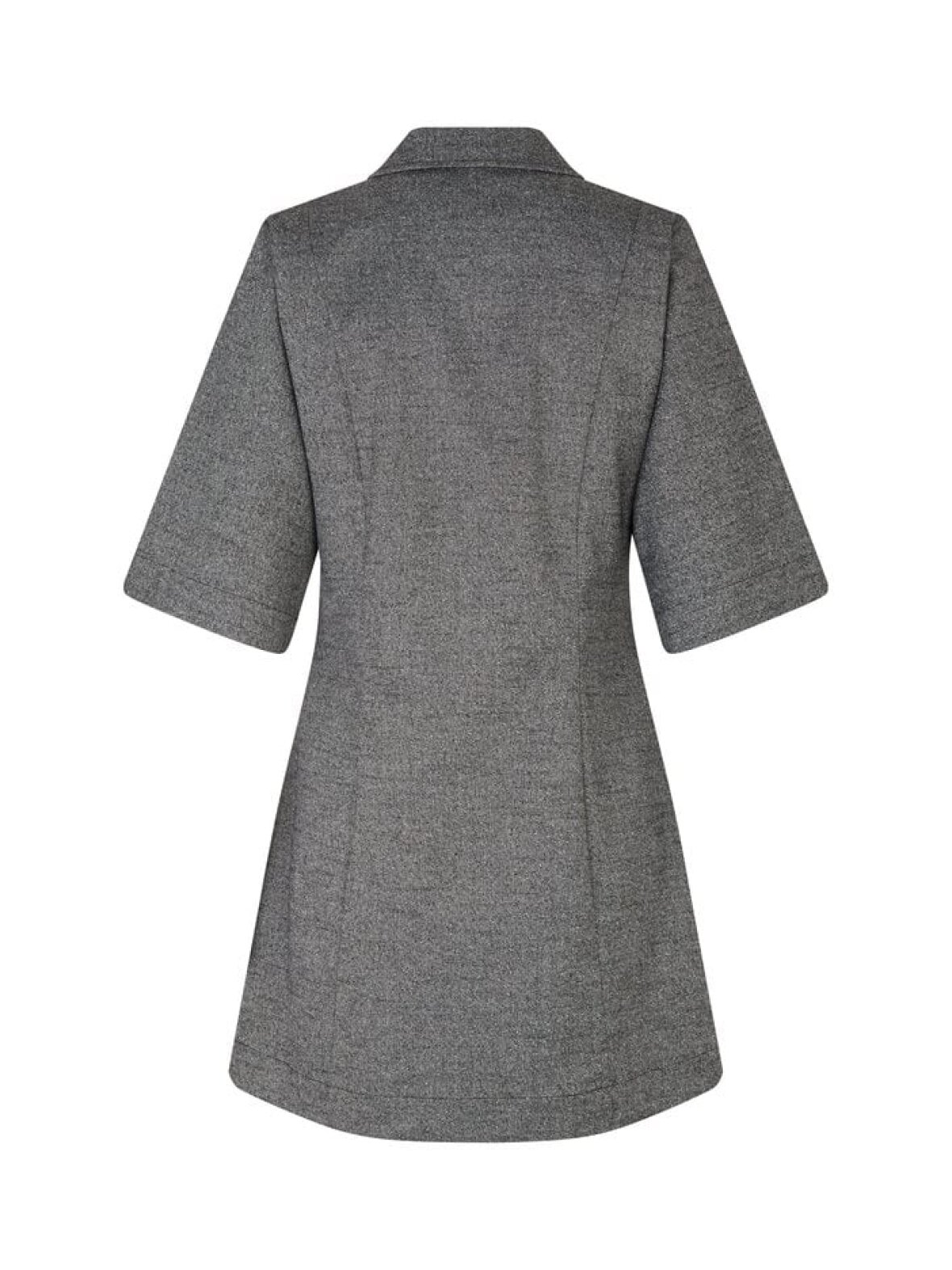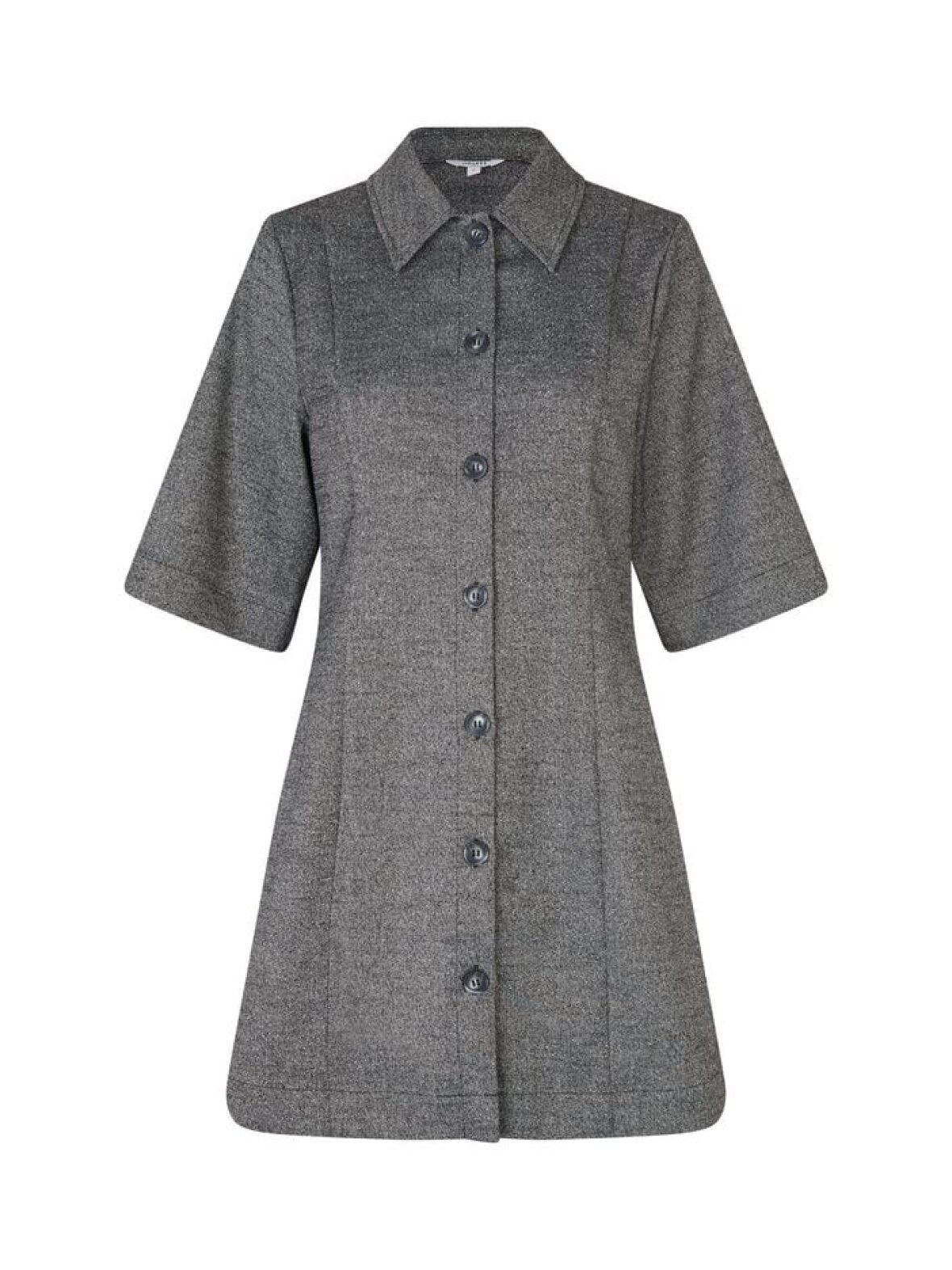 Denne grå skjortekjole fra mbyM er et feminint og stilrent valg til både hverdag og fest. Med sin løse pasform, korte ærmer og knaplukning får du en let og behagelig kjole, der kan styles på mange måder. Brug den med sandaler for et casual look eller med støvler og blazer for en mere chic stil.