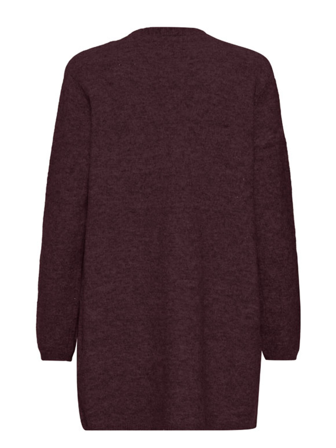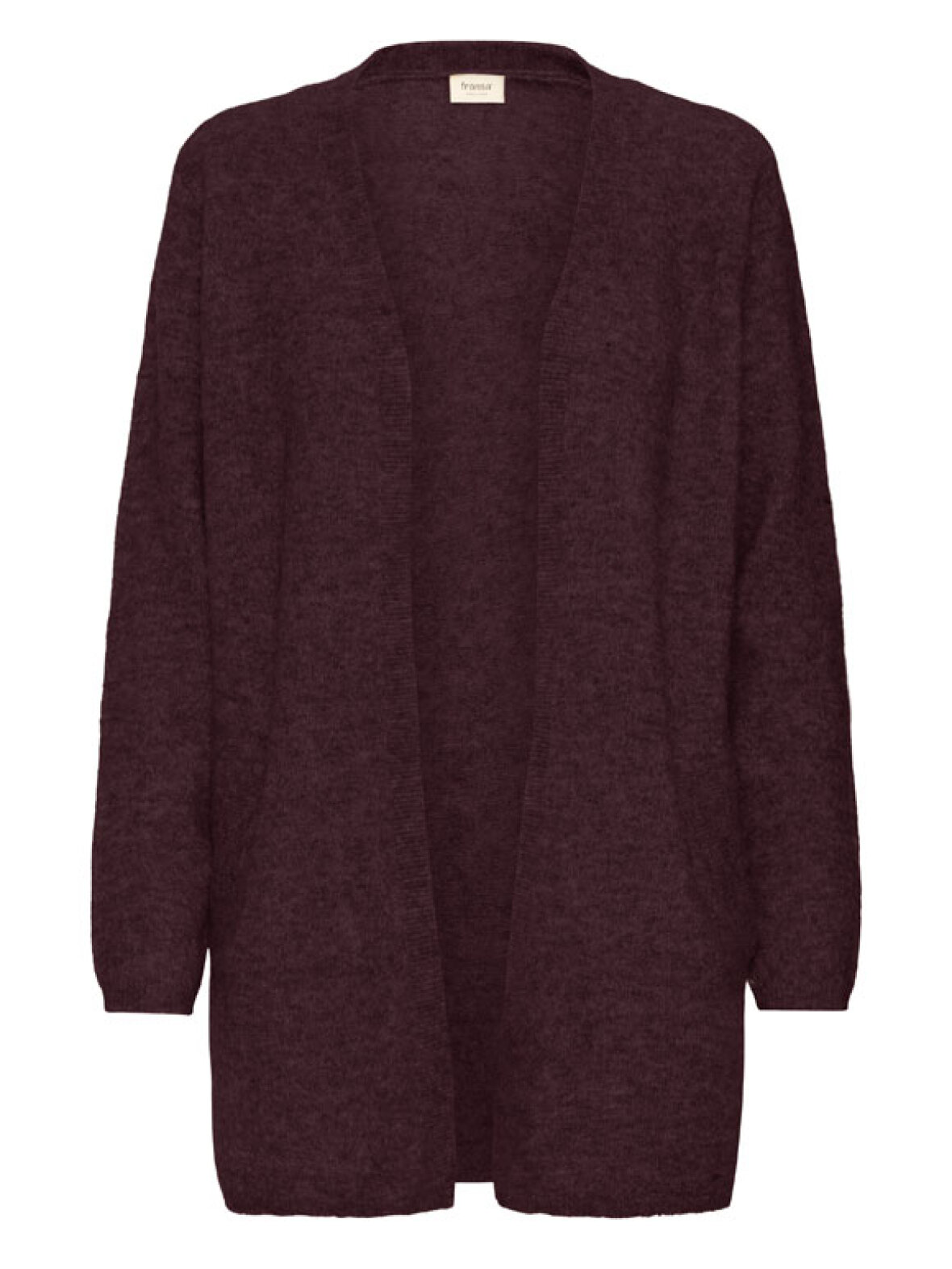 Blød cardigan fra Fransa i en smuk bordeaux nuance. Cardiganen har en afslappet pasform med åben front og lange ærmer, hvilket gør den perfekt til lag-på-lag styling. Den strikkede kvalitet med uld giver varme og komfort – ideel til både hverdag og arbejde.