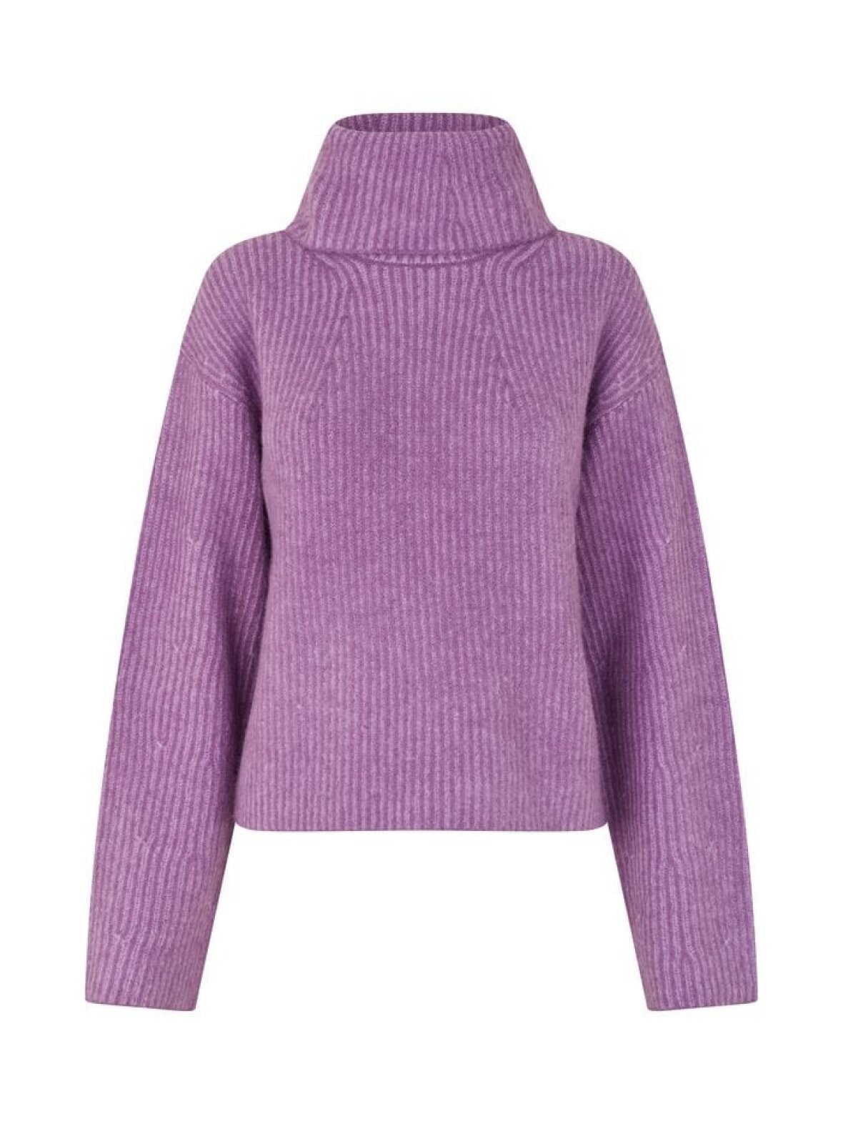 Kemina-M strikken fra mbyM er en skøn og farverig tilføjelse til garderoben. Den bløde kvalitet og løse pasform giver masser af komfort, mens den høje rullekrave og de fine ribdetaljer skaber et moderne og hyggeligt look. Den lilla nuance tilføjer et friskt pust til både hverdags- og kontoroutfits.