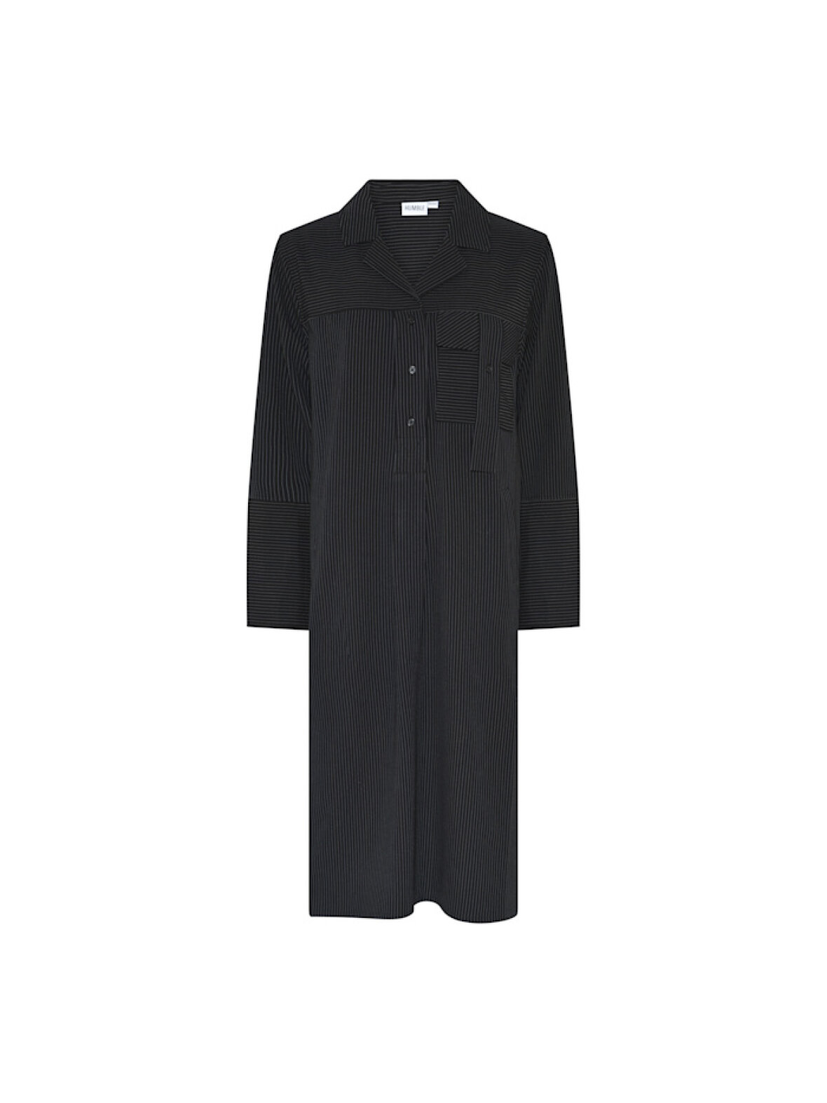 Denne elegante skjortekjole fra Humble by Sofie kombinerer klassisk skrædderstil med moderne komfort. Den har et lige snit, krave, knaplukning foran og praktiske brystlommer. De fine hvide striber skaber et sofistikeret udtryk, perfekt til både kontor og hverdag. Brug den med støvler for et cool look eller sneakers for et afslappet twist.
