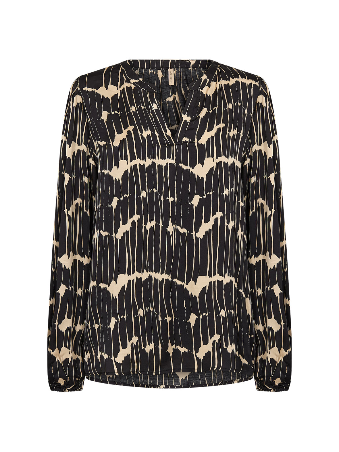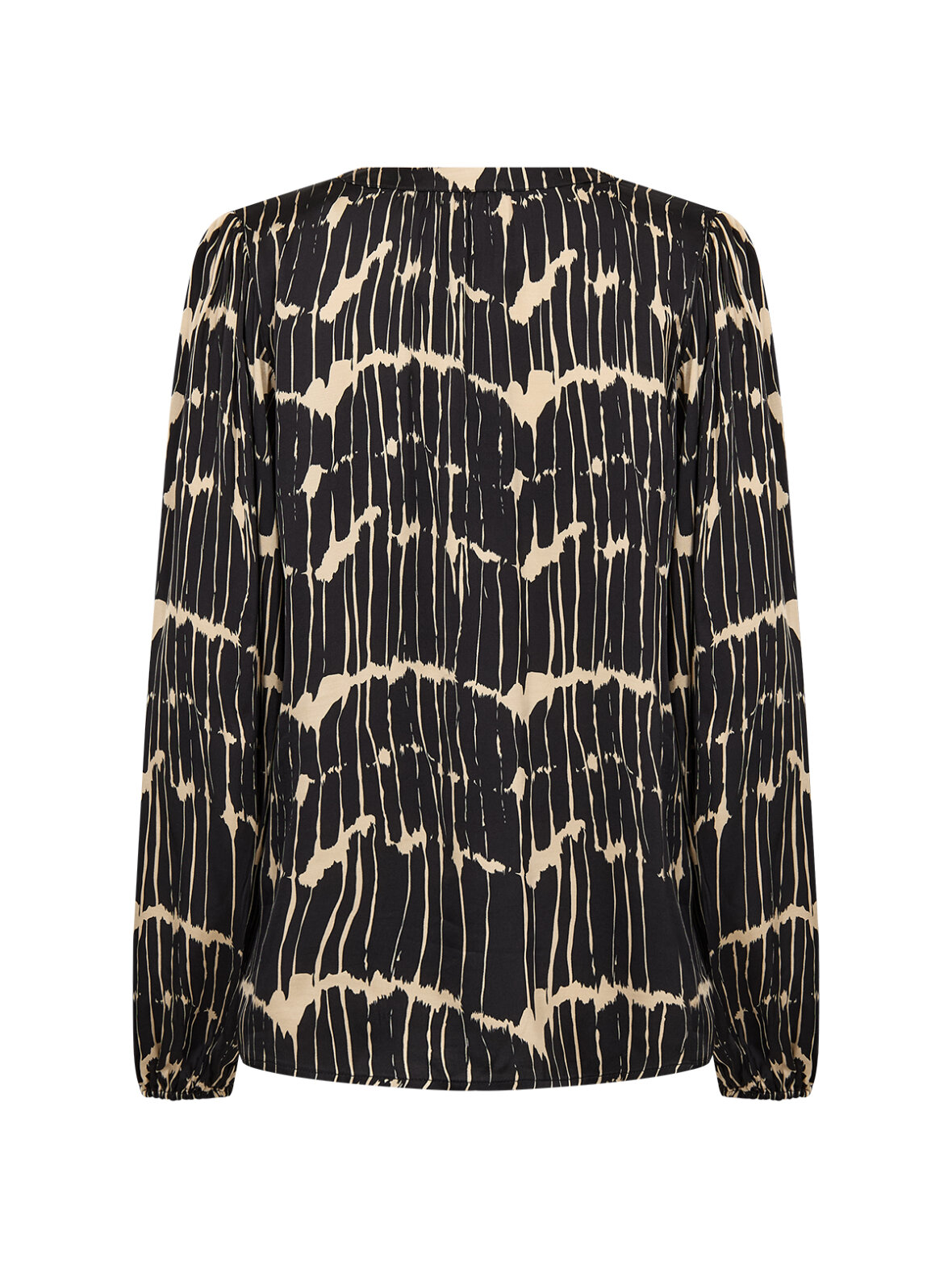 Blød og elegant skjorte med et levende grafisk print i sort og sand. Den let løse pasform, V-udskæring og elastik i ærmekanten gør den både komfortabel og feminin – perfekt til hverdagslooks med lidt ekstra kant.