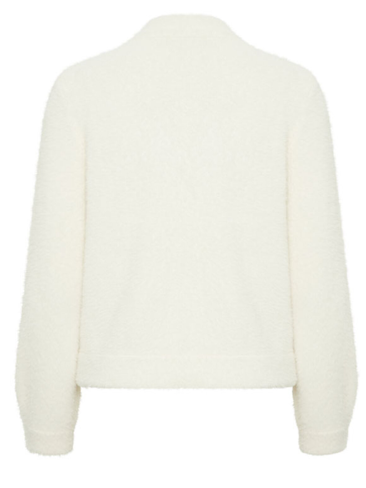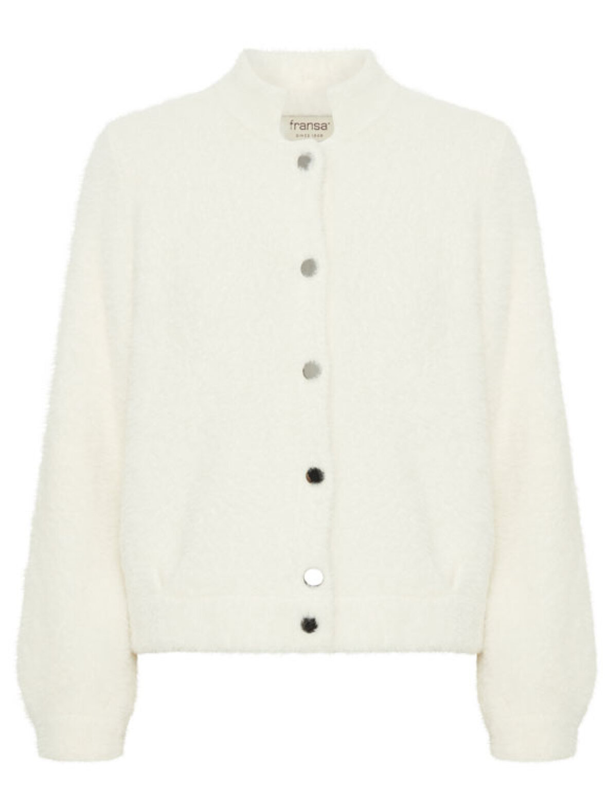 FRReese cardiganen fra Fransa er den perfekte kombination af komfort og elegance. Den offwhite nuance og de sølvfarvede trykknapper giver et rent og klassisk udtryk, mens den bløde tekstur tilfører et luksuriøst touch. Brug den som et let lag over kjoler, skjorter eller T-shirts – et alsidigt valg til både kontor og hverdag.