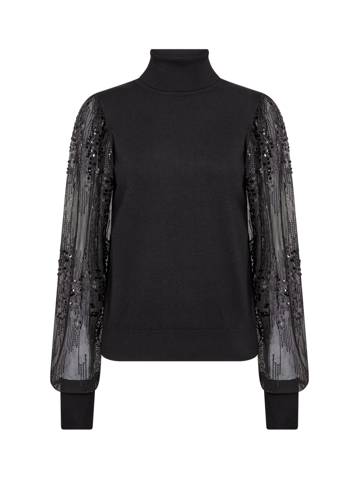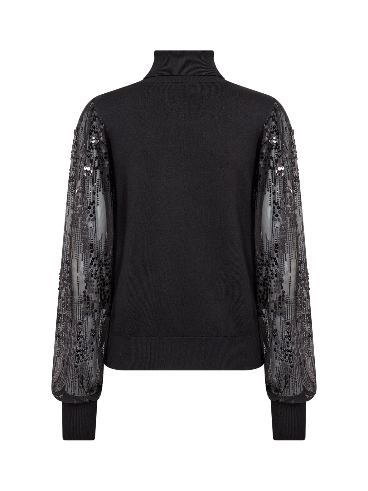En elegant sort bluse, der kombinerer en blød strikket body med transparente mesh-ærmer pyntet med pailletter. Perfekt til alt fra middage og fester til hverdagslooks, hvor du vil løfte outfittet uden at gå på kompromis med komforten.