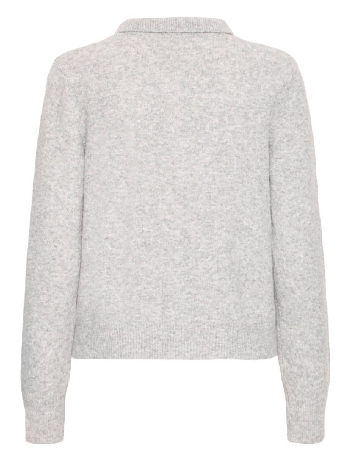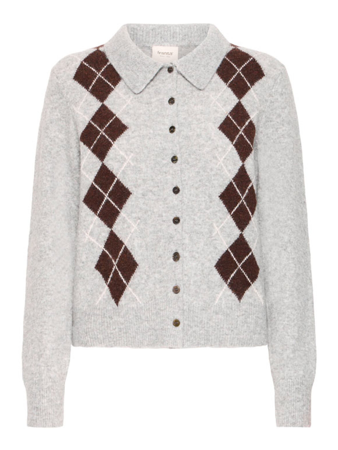 FRNoema cardigan fra Fransa er en moderne fortolkning af den klassiske argyle-strik. Den er designet i en blød grå meleret kvalitet med diamantmønster i varme brune og hvide nuancer. Cardiganen har gennemgående knapper, krave og ribkanter, som giver et feminint og preppy udtryk – perfekt til efteråret.