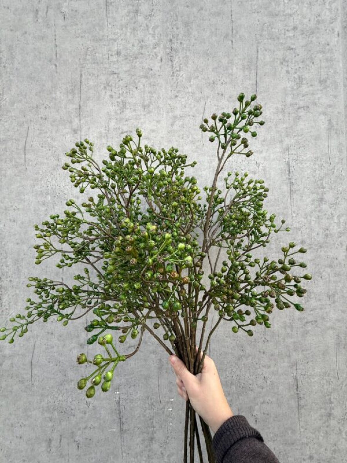 Smuk og fyldig Llex bærgren i en naturlig grøn nuance, der giver liv og struktur til enhver dekoration. Med sine mange små bær og realistiske grene er den perfekt til både juledekorationer, adventskranse og vinterbuketter. Brug den alene i en høj vase eller som base i en større opstilling – et tidløst valg, der holder år efter år.