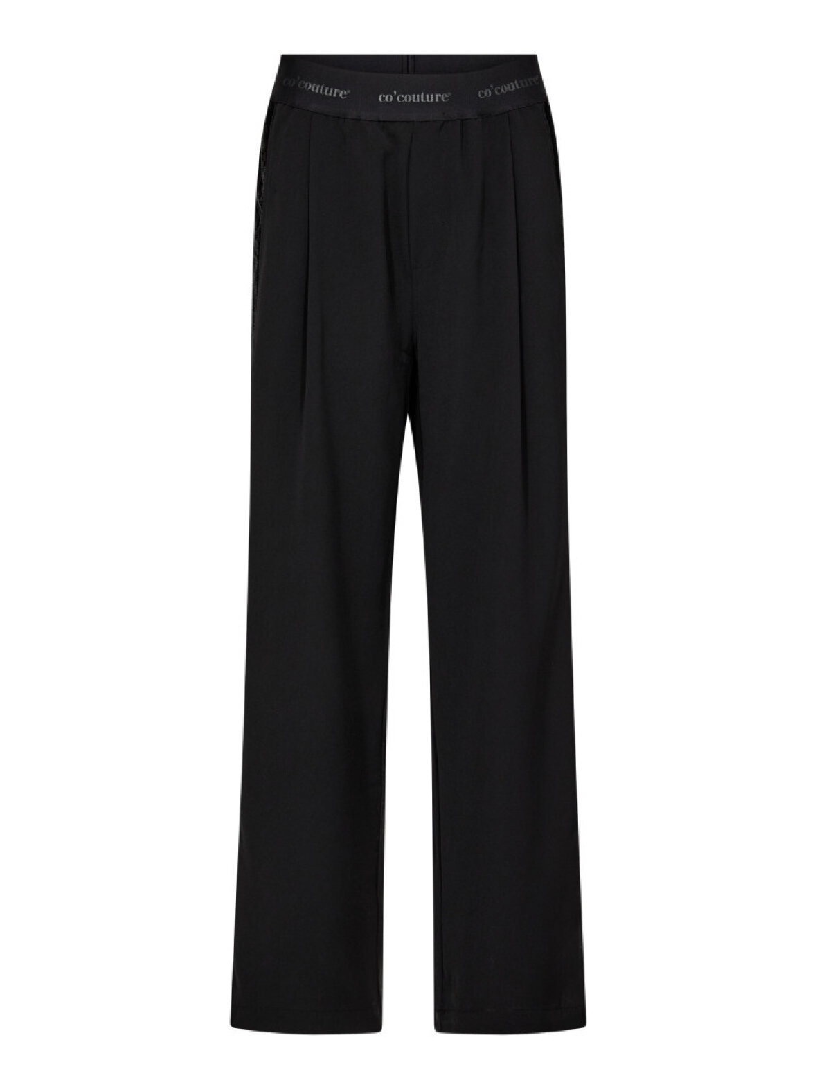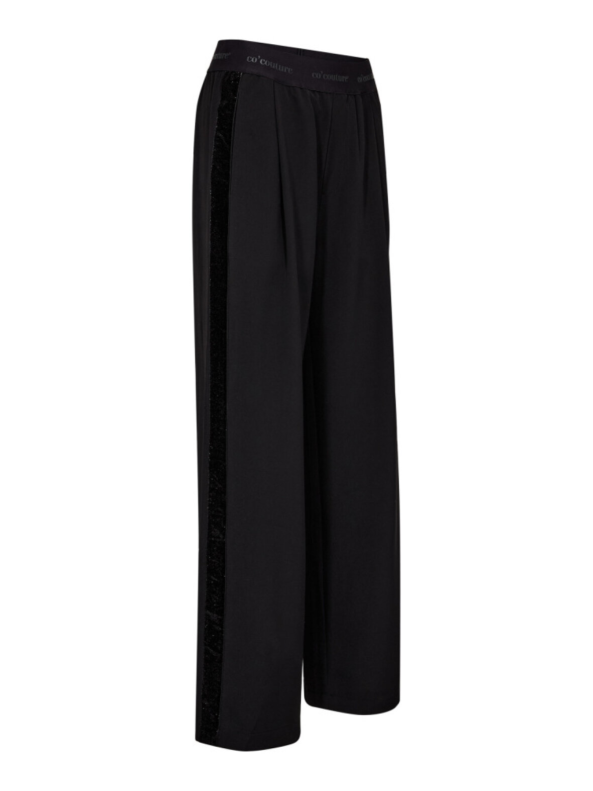 AminaCC Logo Shimmer bukserne fra Co’Couture kombinerer komfort med et eksklusivt udtryk. De har elastisk logo-talje med Co’Couture-skrift, blød kvalitet med let shimmer og festlige glimmer striber langs siderne. Den lige pasform giver et sofistikeret, sporty look – perfekt både til hverdag og fest.