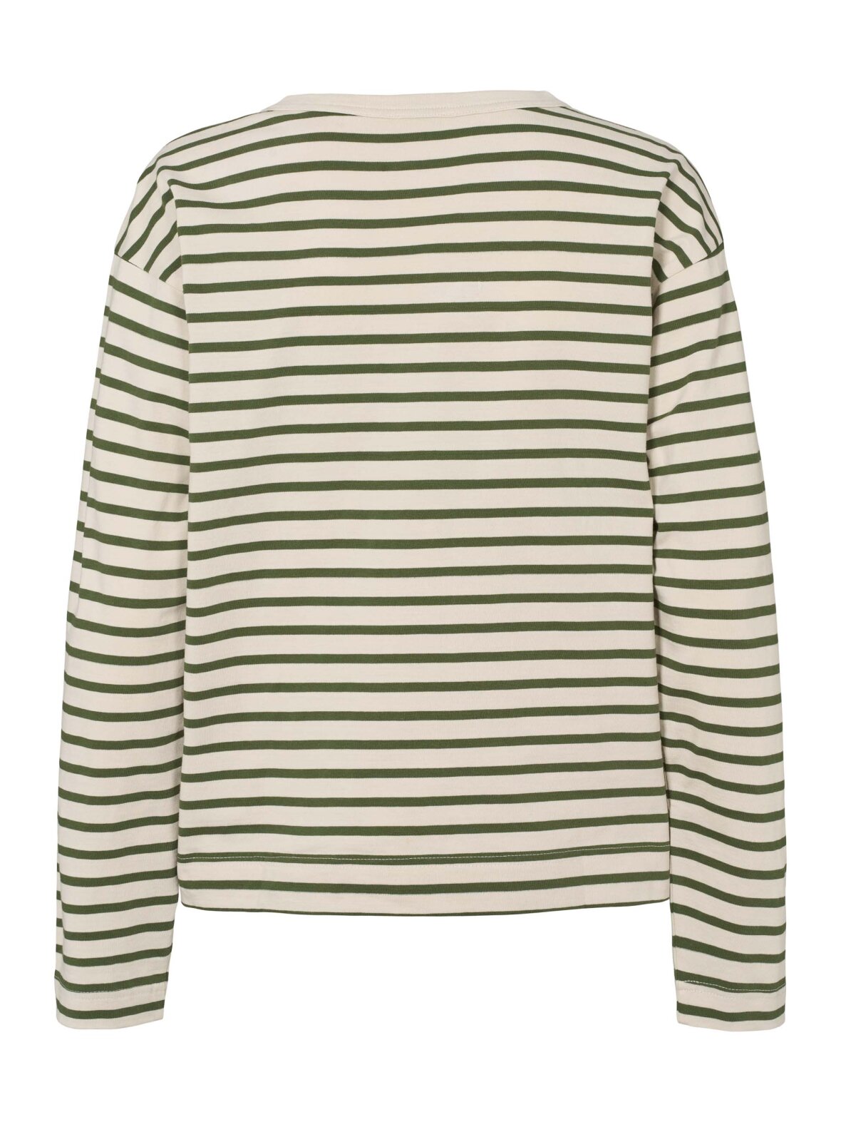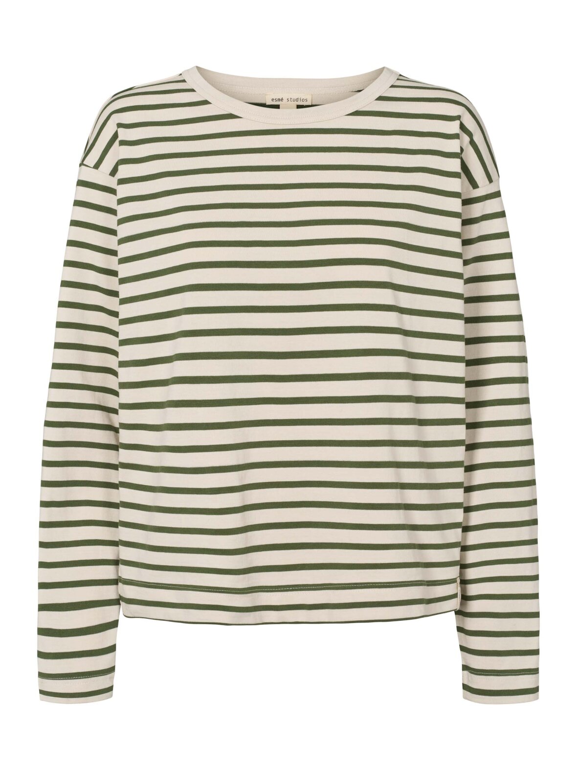 ES425-329 ESTine LS, T-Shirt – Offwhite/grøn stribet langærmet tee i økologisk bomuld