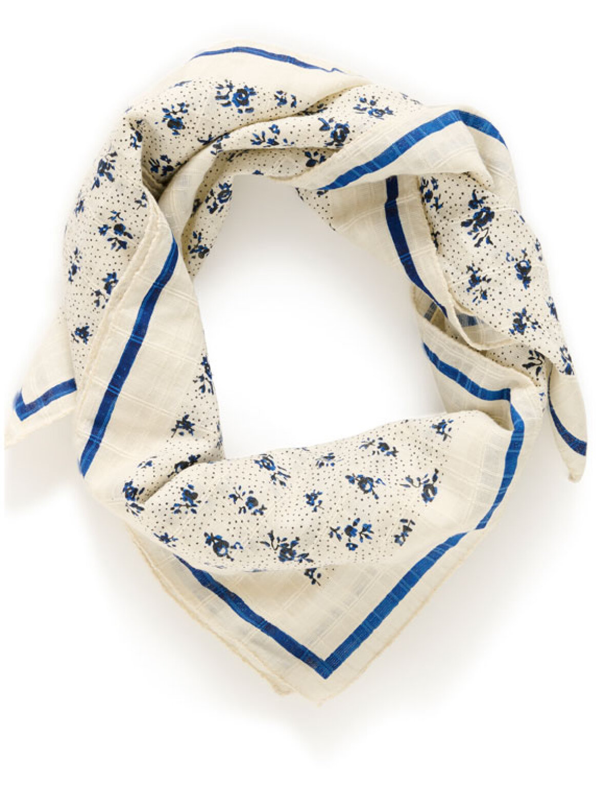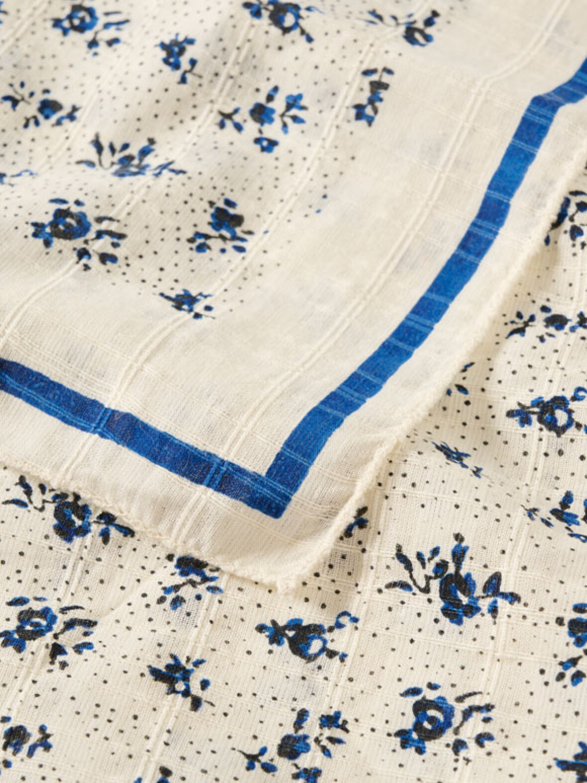 OmeliaSZ tørklædet er den lille detalje, der gør hele forskellen. Det lette bomuldsdesign har et romantisk mini-blomstermønster og en smuk blå kant, der giver et friskt og feminint udtryk. Brug det i håret, om halsen, på tasken – eller som et fint accessory til sommerens outfits.