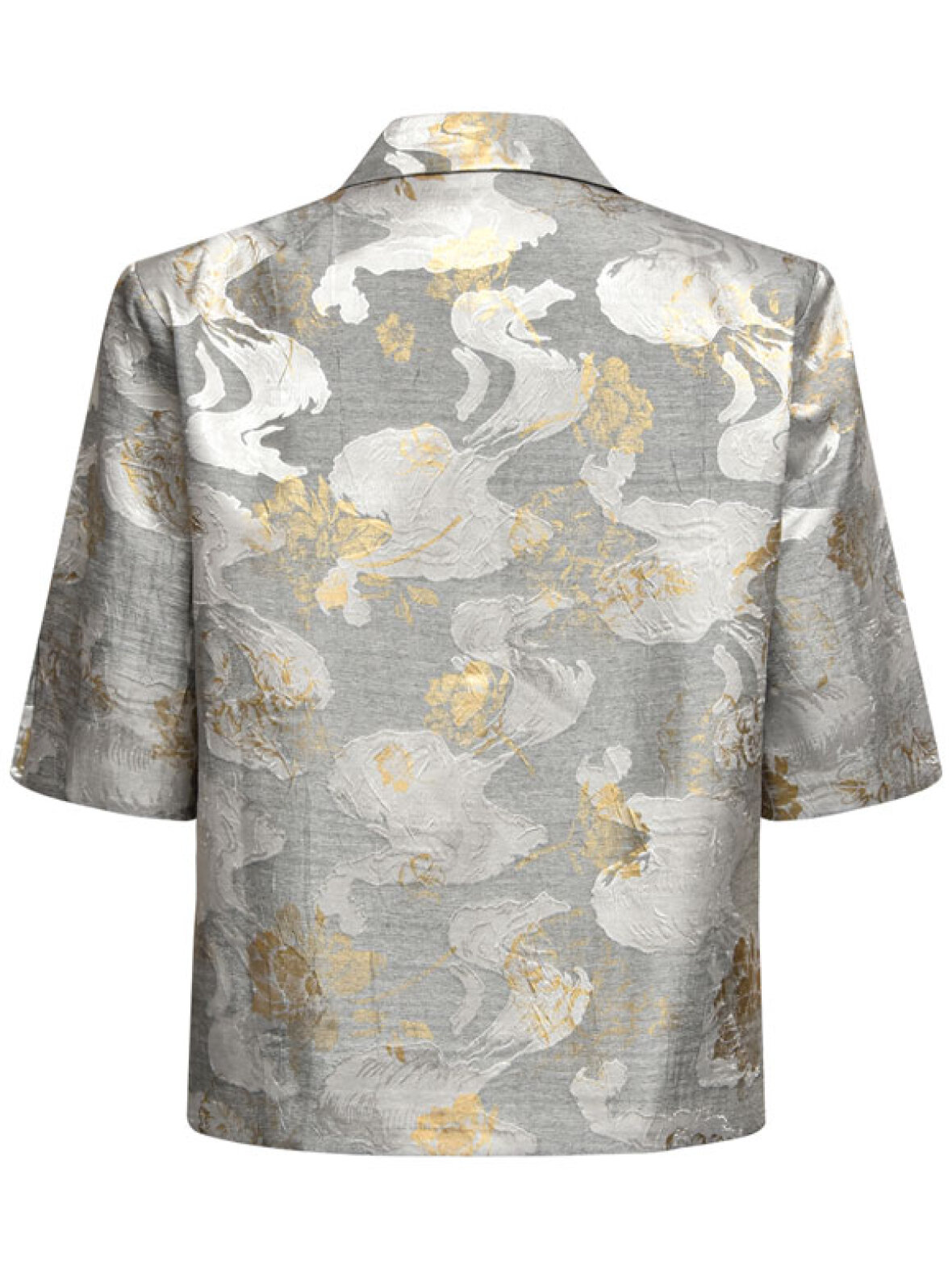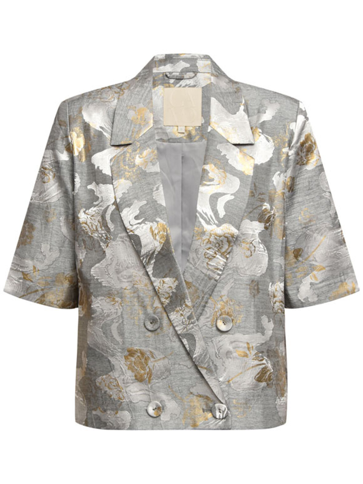 KalimayaGO blazer fra Gossia er en statement-jakke, der skruer op for glamouren i hverdagen. Den smukke sølvgrå nuance kombineret med det gyldne og hvide mønster giver et eksklusivt og elegant look, der løfter ethvert outfit. Brug den både til fest, over en enkel top eller som et cool twist til jeans.