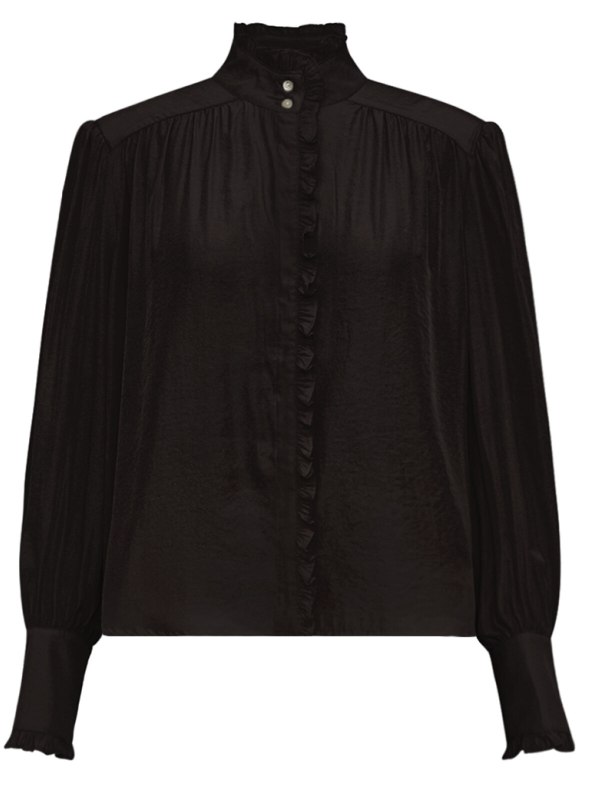 En luksuriøs brun skjorte fra Gossia, designet til dig der elsker et feminint, eksklusivt udtryk. AnjilaGO har fine flæsedetaljer langs knaplukningen, en høj krave og elegante manchetter – alt sammen i en smuk, let blank kvalitet, der falder flot og levende. Modellen er til den store side, så du får et ekstra behageligt og rummeligt fit.