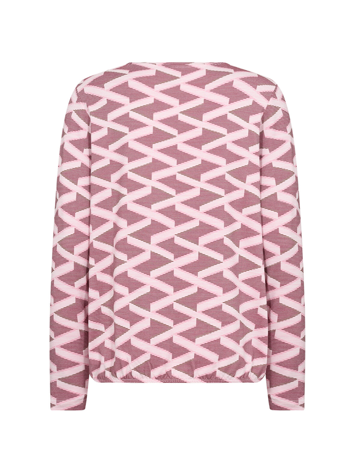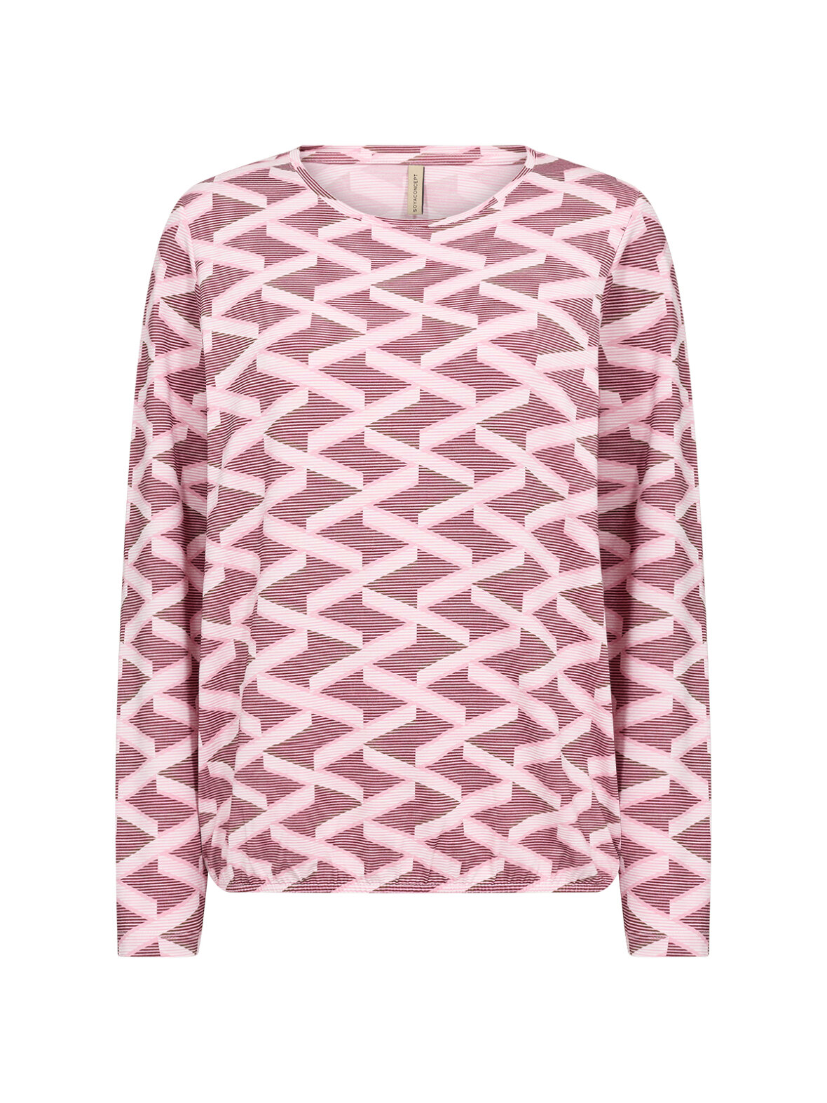 SC-Galina 69 fra Soya Concept er en feminin bluse med et flot grafisk zigzag-mønster i lyserøde nuancer. Den bløde viskoseblanding og elastikken i livet giver en behagelig pasform, der falder flot og sidder godt hele dagen. En nem hverdagsfavorit, der både kan bruges alene eller styles under en blazer.