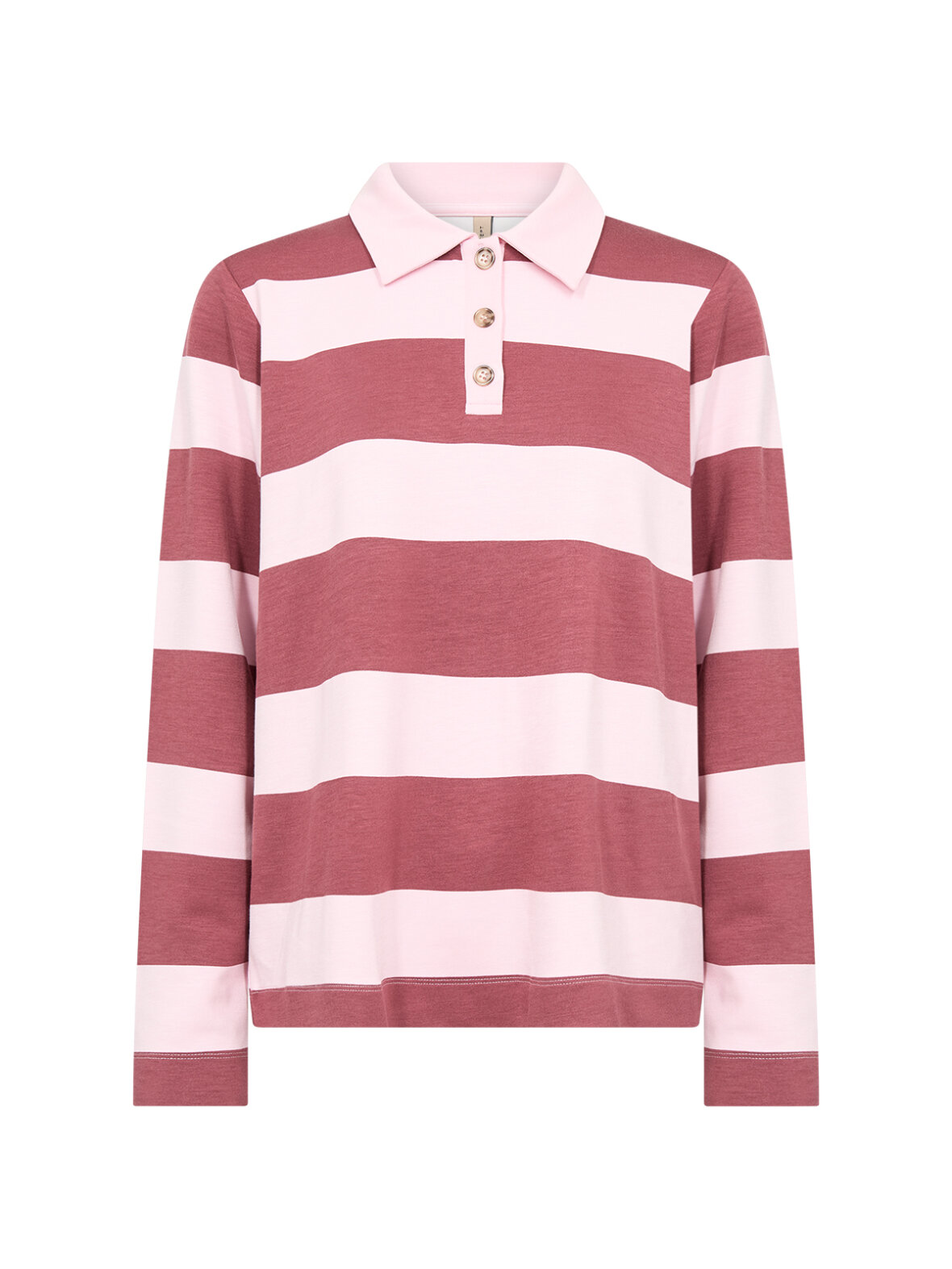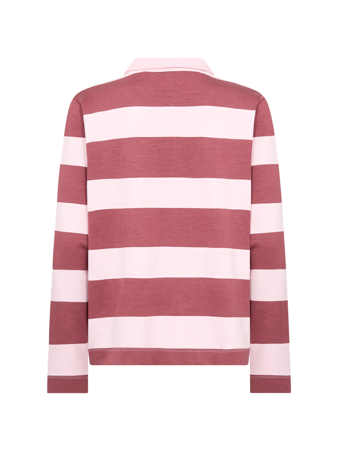 En blød og komfortabel polo med brede striber i rosa toner, der giver et afslappet og moderne udtryk. Modellen har klassisk krave, knappelukning og lange ærmer, mens den strækbare kvalitet sikrer en behagelig pasform hele dagen. Perfekt til både hverdag, arbejde og afslappede weekendlooks.