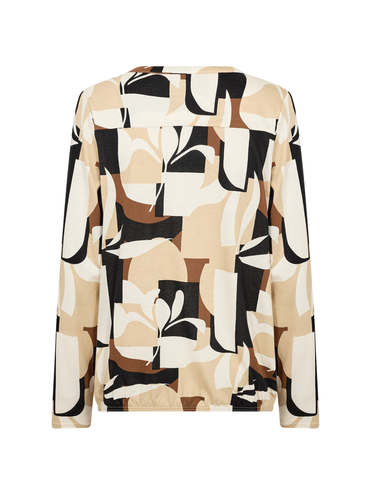 Smuk og let bluse med grafisk print i varme brune, beige og sorte nuancer. SC-Felicity 531 har en afslappet pasform med lange ærmer, en lille V-udskæring og elastik i livet, som giver et let feminint fald og en flot silhuet. Den bløde blanding af økologisk bomuld og viskose gør blusen behagelig at have på hele dagen. En alsidig style, der nemt kan bruges til både hverdag og arbejde – style den med jeans, sorte bukser eller en enkel nederdel.