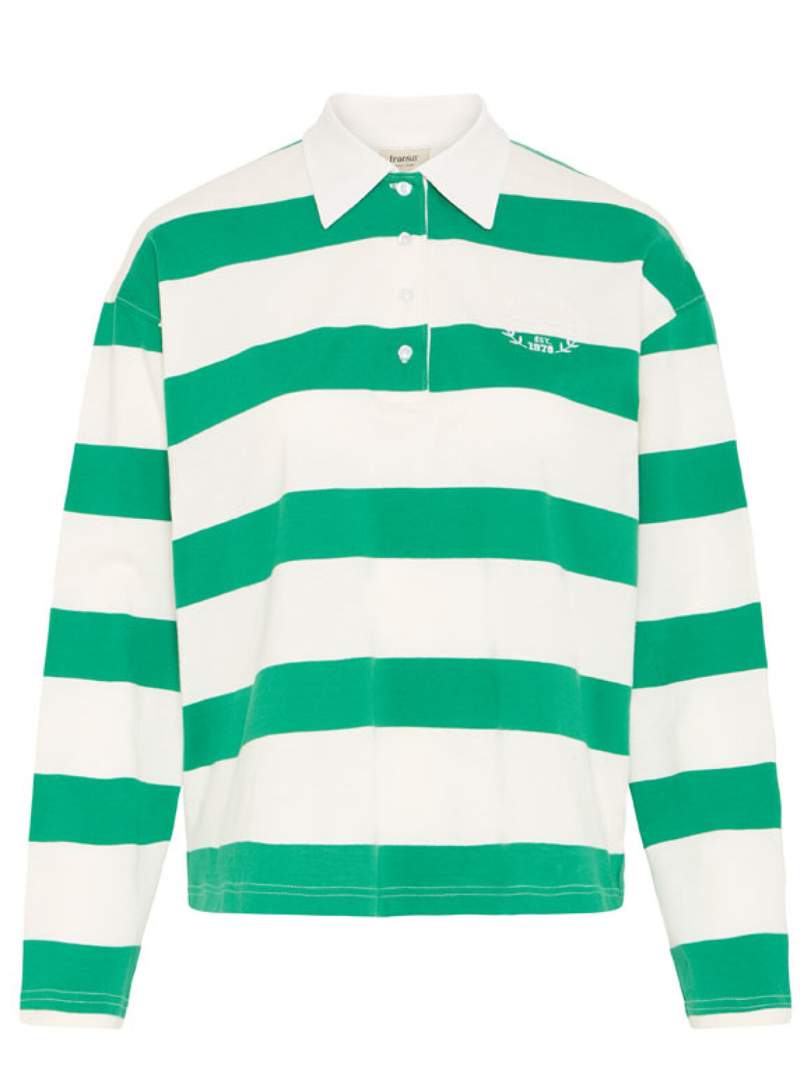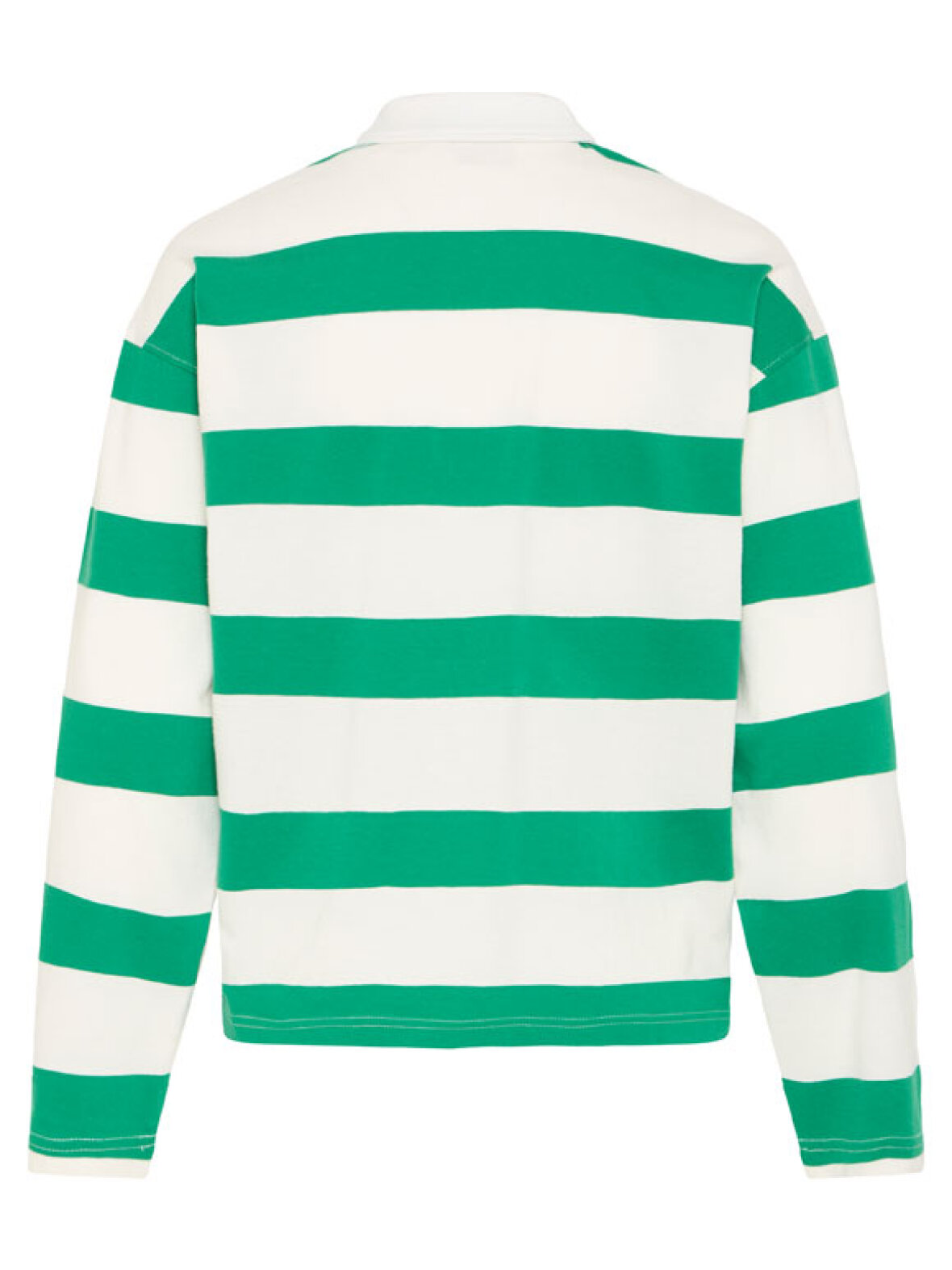 FRSigma 1 poloen fra Fransa er et sporty og stilrent valg med et klassisk twist. De brede grønne og hvide striber kombineret med polokrave og knaplukning giver et afslappet, men velklædt look. Poloen er lavet i blød og åndbar bomuld, som er behagelig at have på hele dagen, og den tidløse pasform gør den nem at style med både jeans, bukser og nederdele – perfekt til hverdag, arbejde og weekend.
