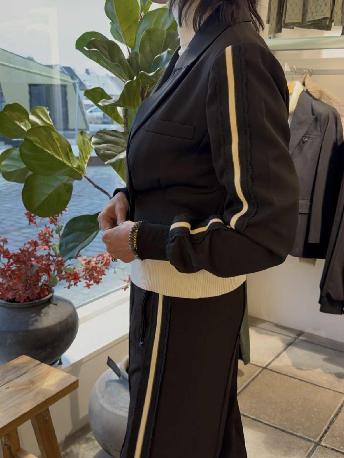 Et par lækre sorte bukser fra Gossia med en cool sporty vibe. Den løse pasform, bløde kvalitet og elastiske talje gør dem perfekte til både hverdagslooks, afslapning og et stilrent athleisure outfit. De fine striber langs siderne giver en ekstra detalje, der løfter looket.