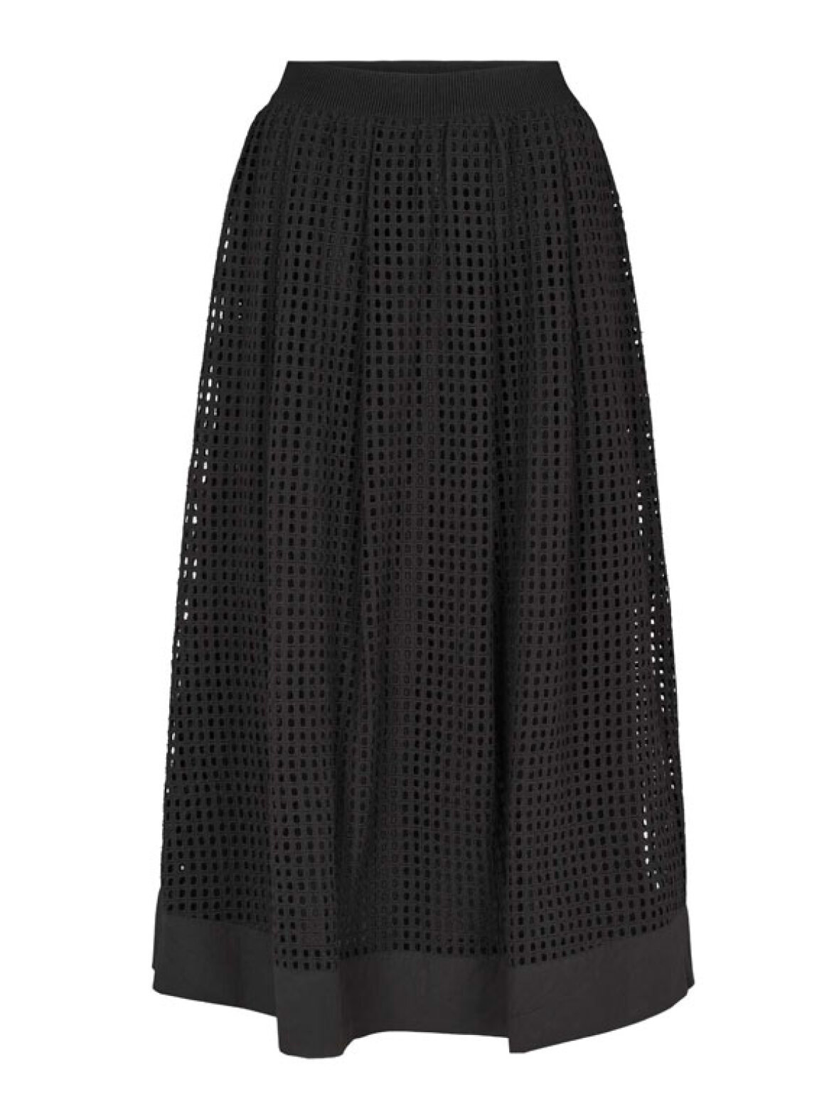 Smuk sort nederdel med eksklusiv struktur og flot volumen. ESSonna fra esmé studios er lavet i 100% GOTS-certificeret økologisk bomuld og kombinerer komfort med et feminint, moderne udtryk. Perfekt til både hverdag og fest – style med strik, skjorte eller top.