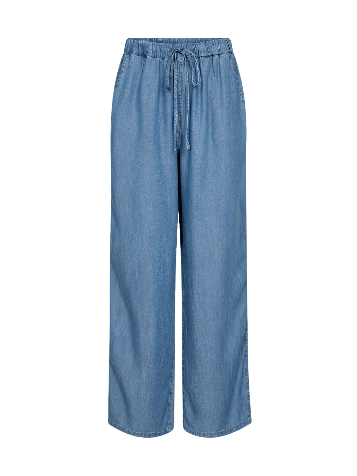 SC-Liv 53-C fra Soya Concept er et par ultralette og komfortable bukser i ren lyocell. De falder blødt, har en afslappet pasform og elastik med bindebånd i taljen, så du får maksimal komfort hele dagen. De brede ben giver et luftigt og casual udtryk – perfekte til både hverdag og ferie.