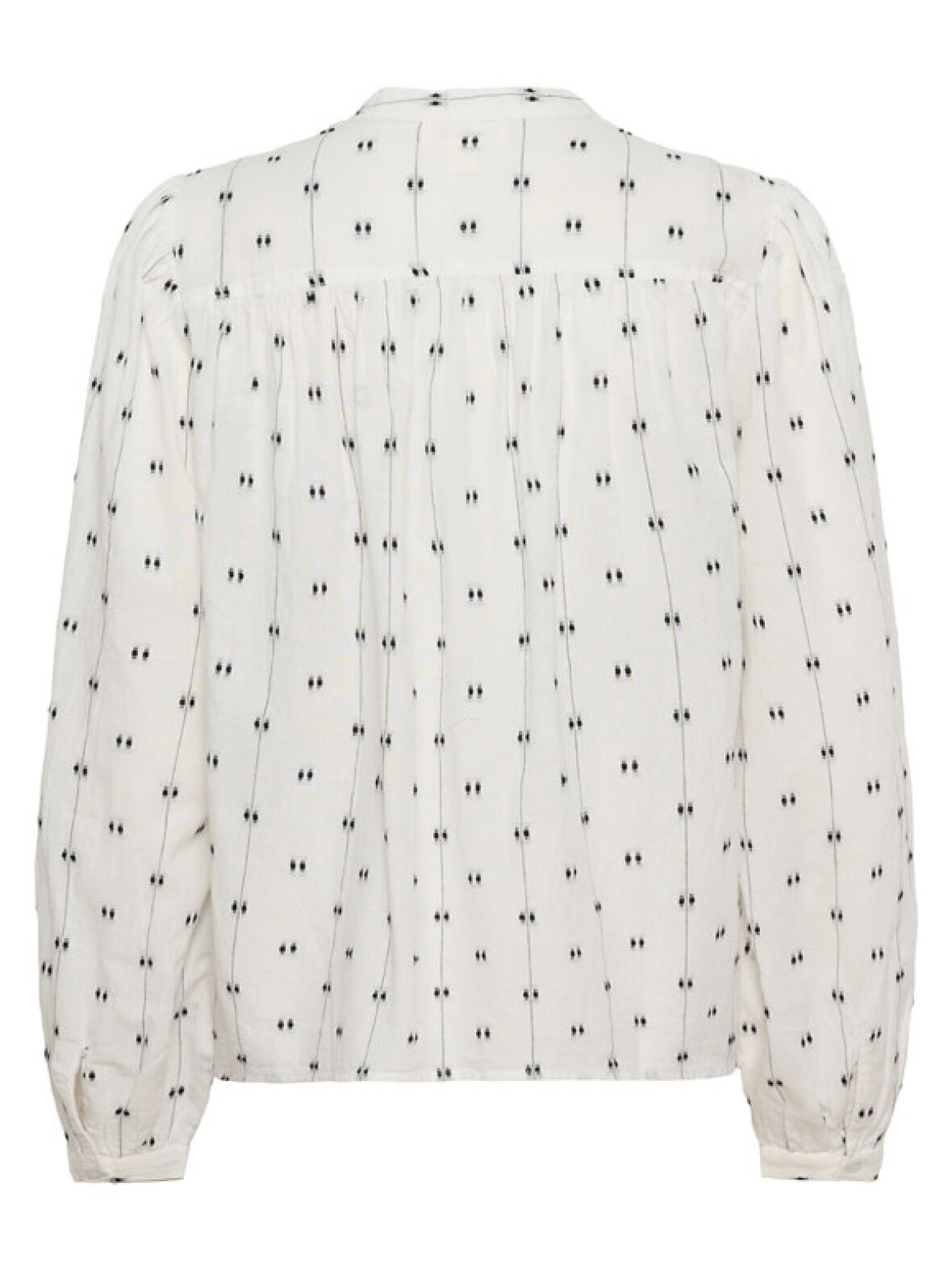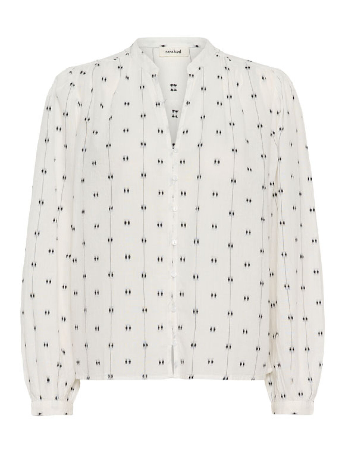 SLAmelie fra Soaked in Luxury er en let og luftig bomuldsskjorte med et fint broderet mønster, der giver et feminint og eksklusivt udtryk. Den har en løs pasform, små læg ved skuldrene og knaplukning foran – perfekt til både jeans og nederdele, når outfittet skal være nemt, men stadig gennemført.
