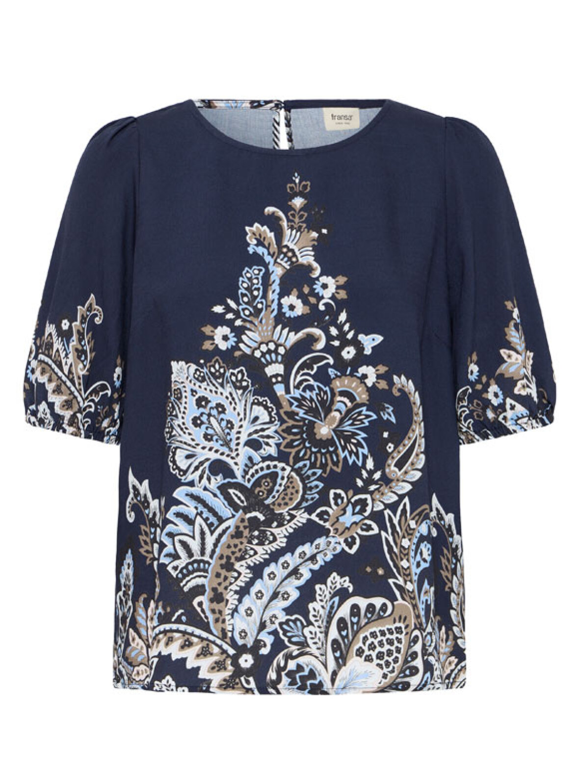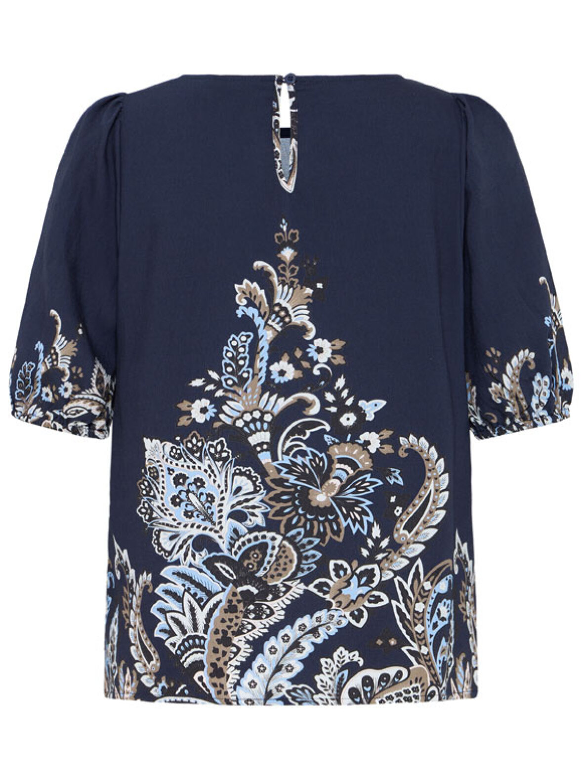 Elegant blå bluse fra Fransa med dekorativt paisley-inspireret print i lyse og varme nuancer. En let og behagelig kvalitet, der falder flot og giver et feminint udtryk – perfekt til både hverdag og pænt brug.