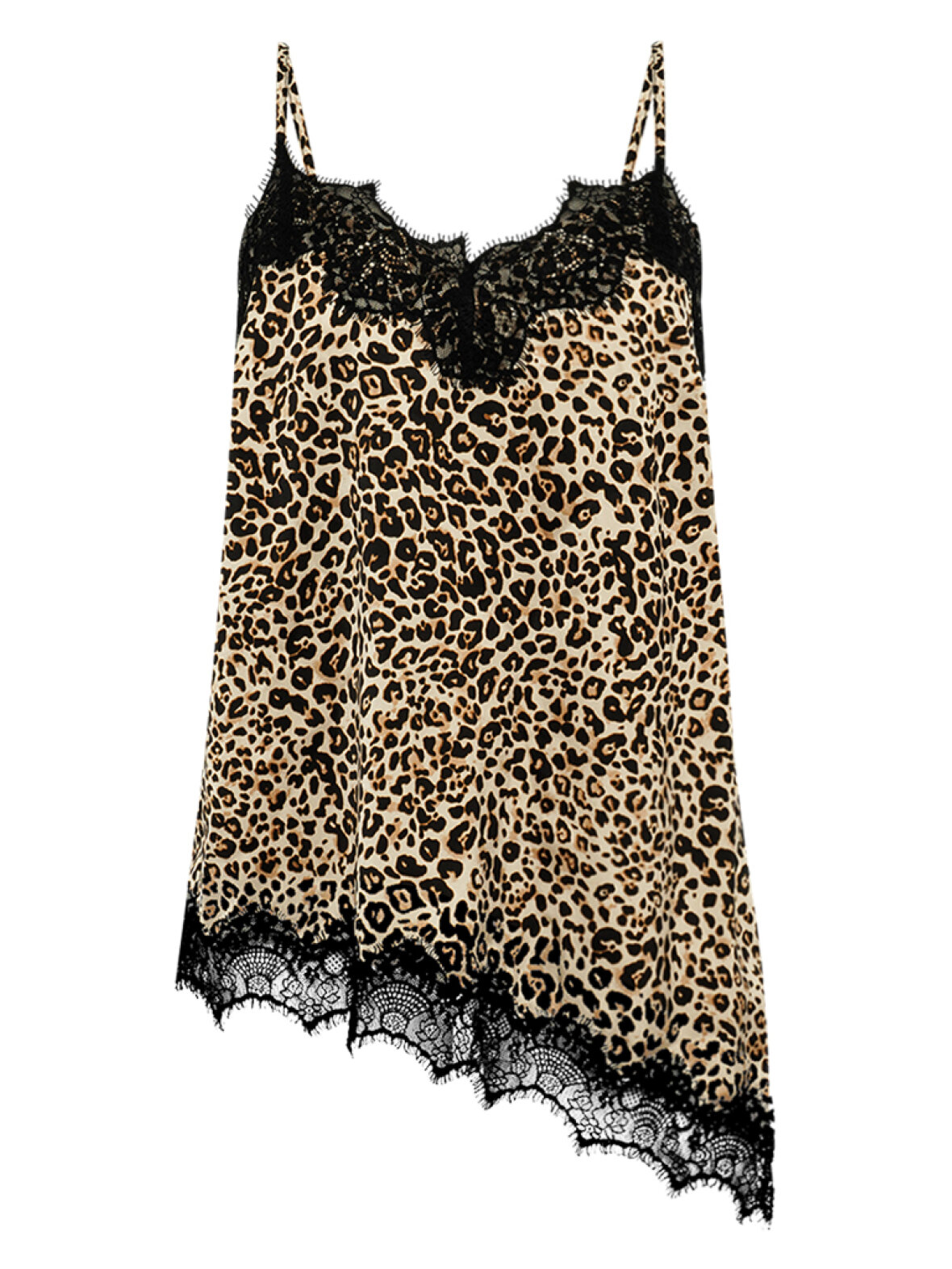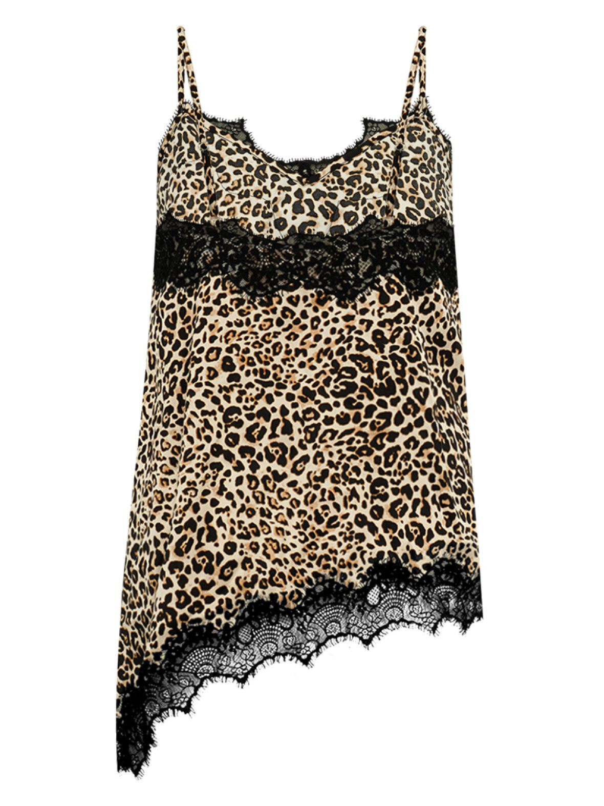 Leopardtop fra Gossia med smukke sorte blondedetaljer, fine stropper og et let asymmetrisk fald. En feminin top med attitude, der både kan styles råt med jeans eller elegant under en blazer – perfekt til fest og hverdag med ekstra wow-effekt.