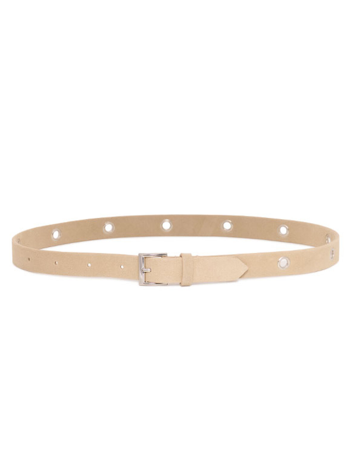 Sandfarvet ruskindsbælte fra Soaked in Luxury med markante metaløjer og klassisk spænde. Et eksklusivt accessory, der løfter både kjoler, jeans og blazere med et cool og moderne udtryk.