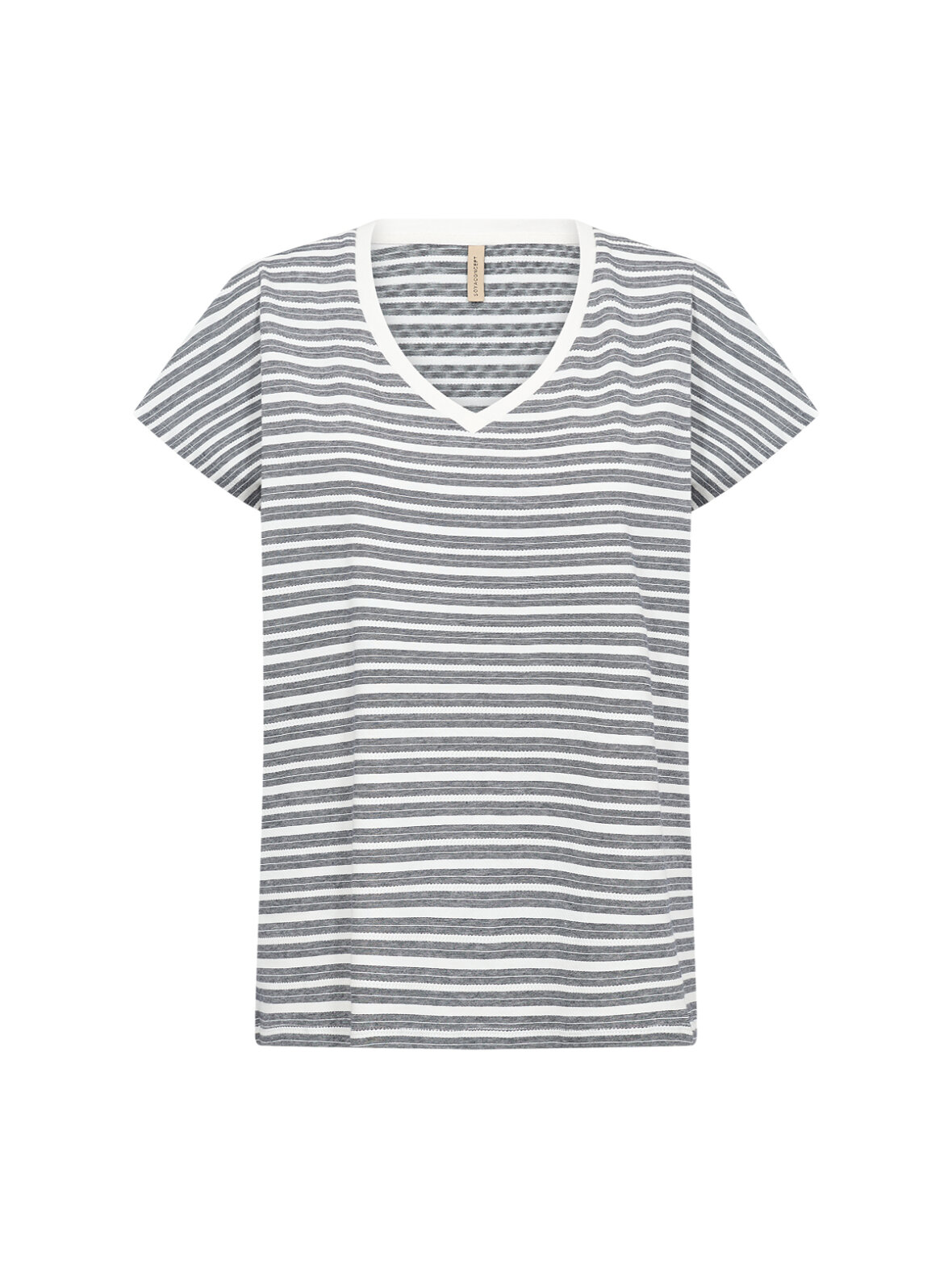 Sort stribet T-shirt fra Soya Concept i 100% økologisk bomuld med tidløse, smalle striber og flatterende V-udskæring. En blød og behagelig basis, der passer perfekt ind i garderoben og nemt kan styles til både hverdag og afslappede weekender.