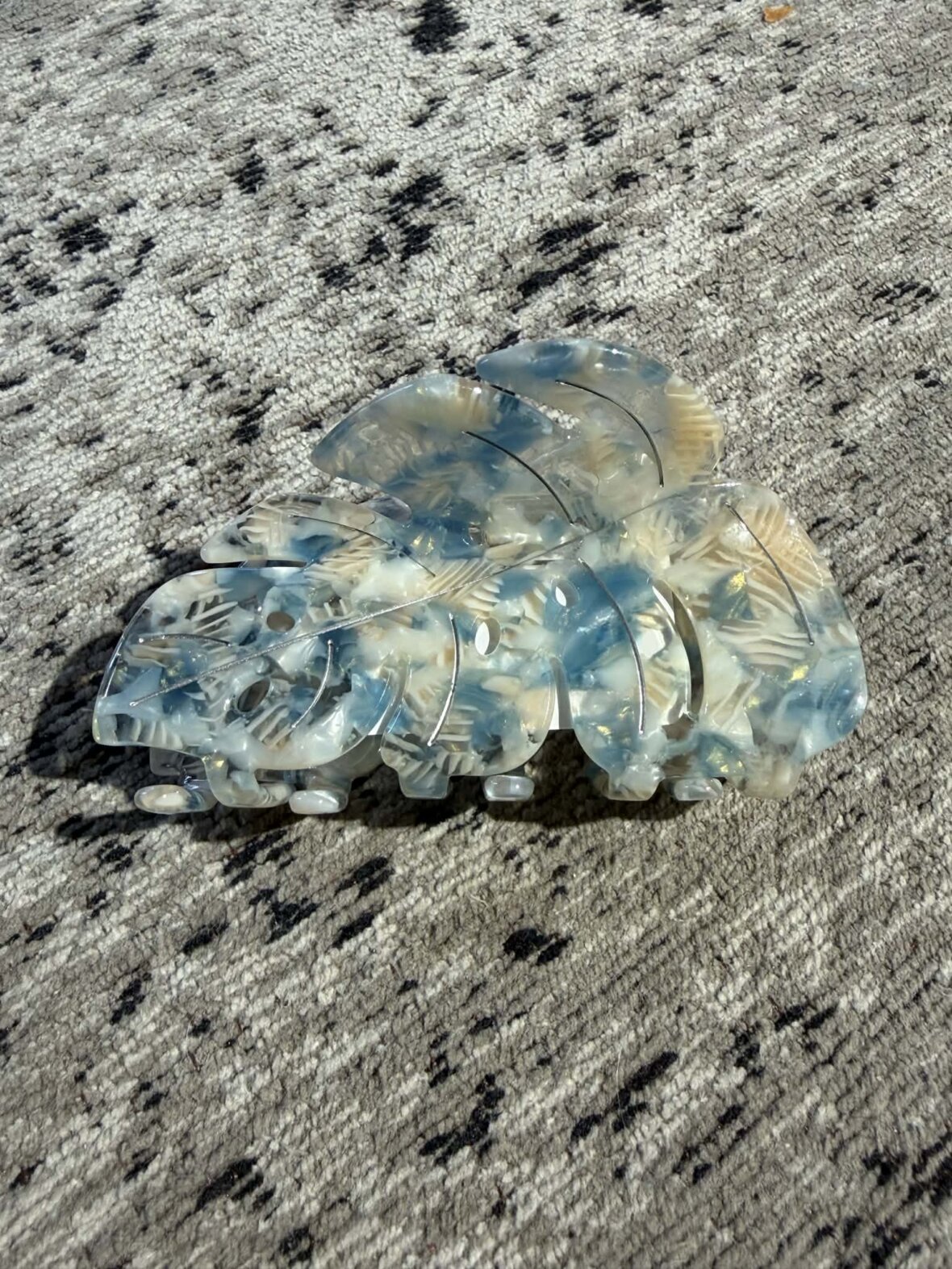 Smuk hårklemme i blå nuancer med elegant blad-design. De bløde marmorerede toner giver et eksklusivt og feminint udtryk – perfekt til dig, der vil pifte frisuren op med en stilfuld detalje.