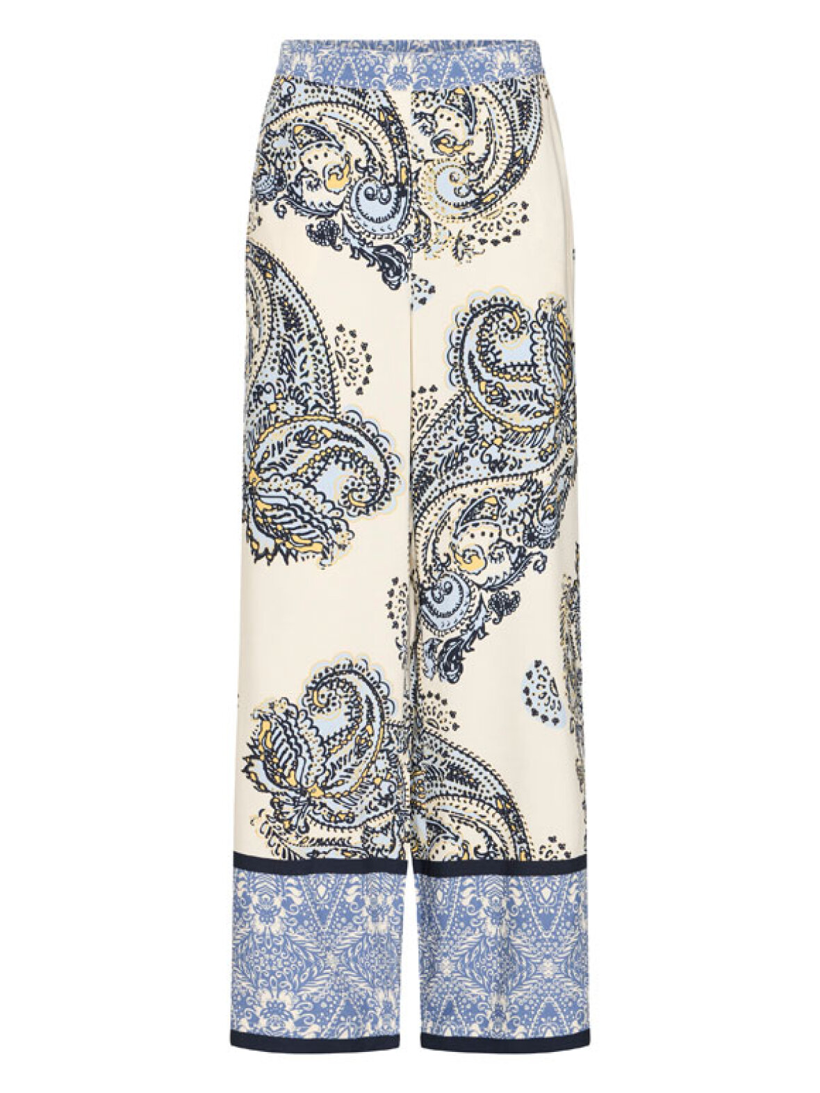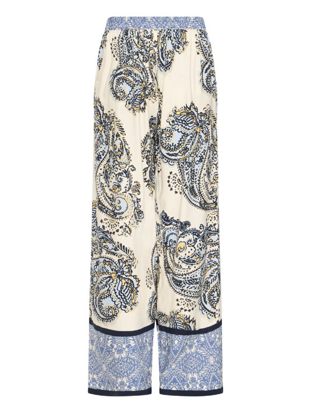 Let og luftig buks i 100% viskose med smukt paisley-print i blå og gyldne nuancer. De vide ben og den elastiske talje giver et afslappet, men eksklusivt udtryk – perfekt til sommer, ferie og feminine hverdagslooks.