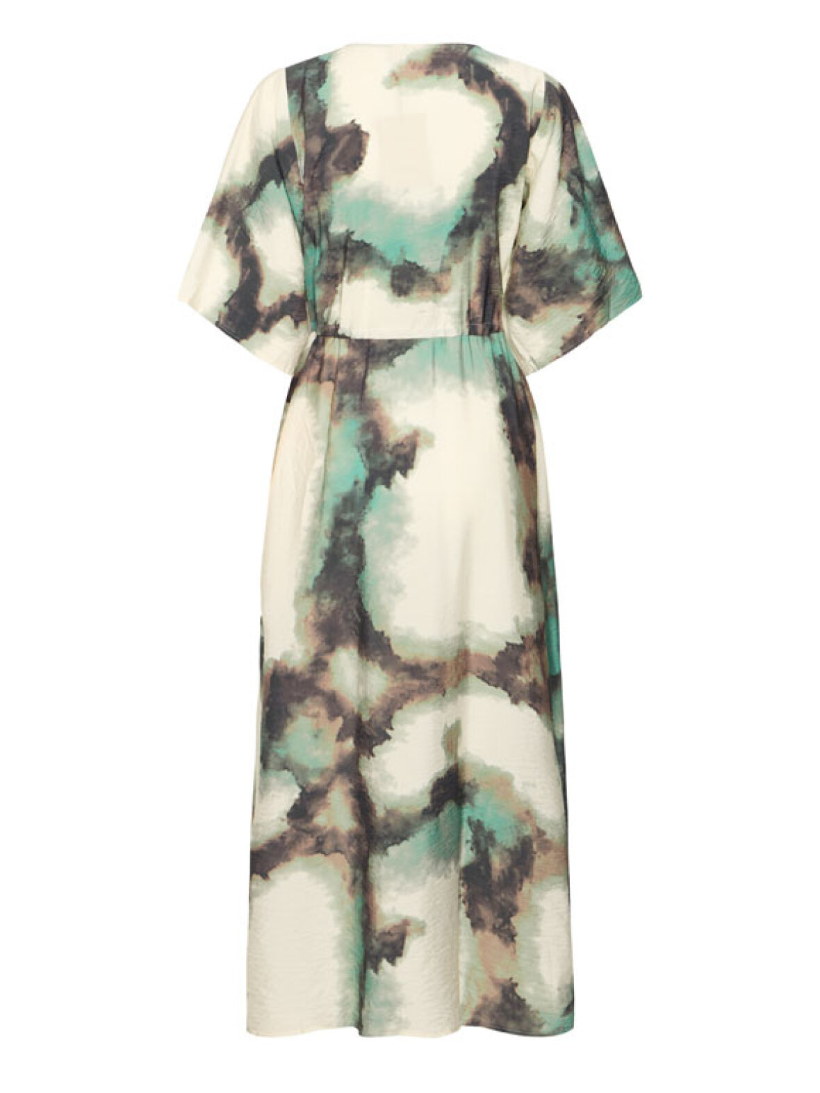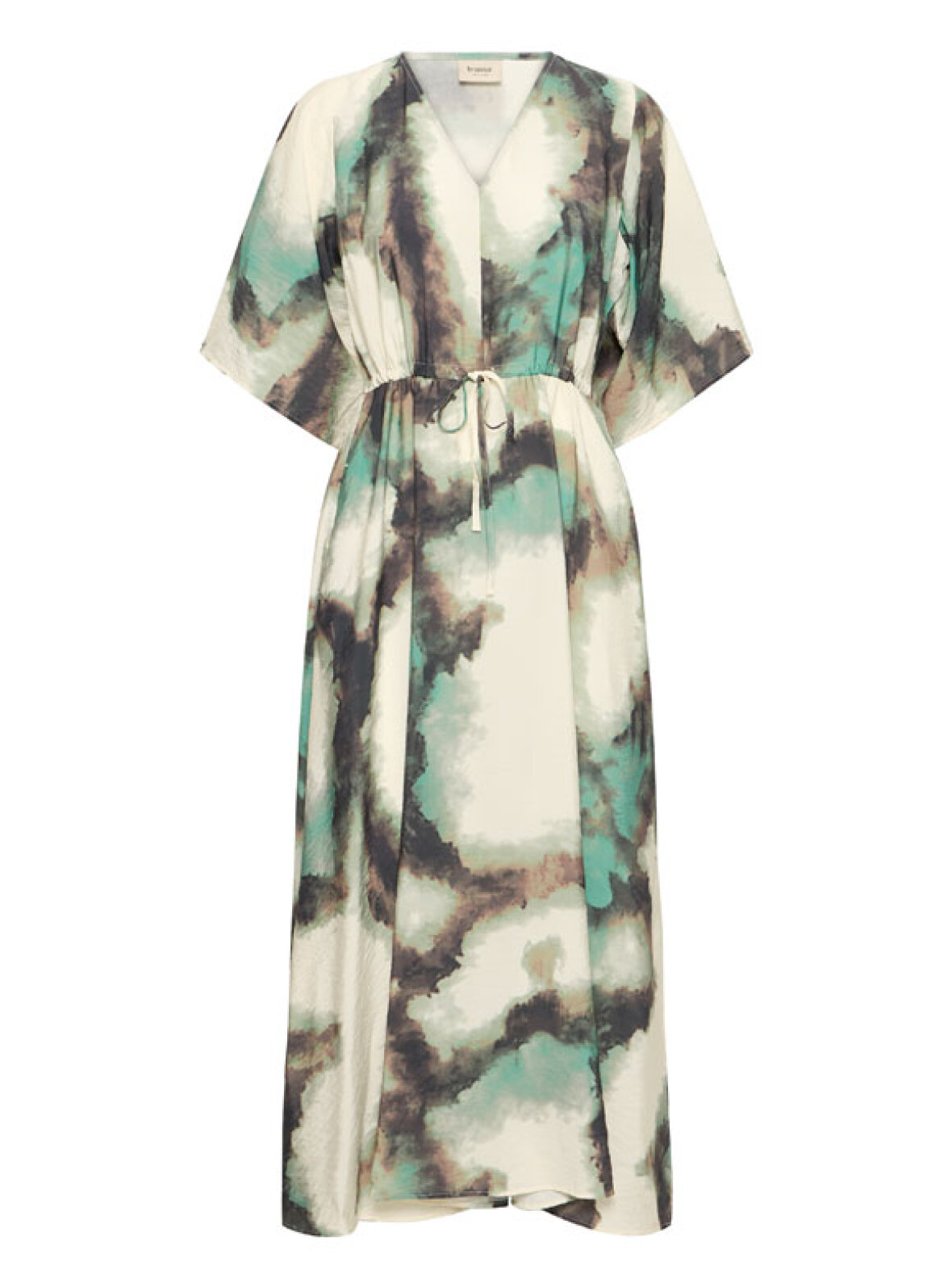 Let og feminin kjole i smukke grønne og jordnære nuancer med et blødt, kunstnerisk print. Modellen har snøre i livet, så du nemt kan fremhæve taljen og tilpasse pasformen – perfekt til både hverdag, arbejde og sommerens arrangementer.
