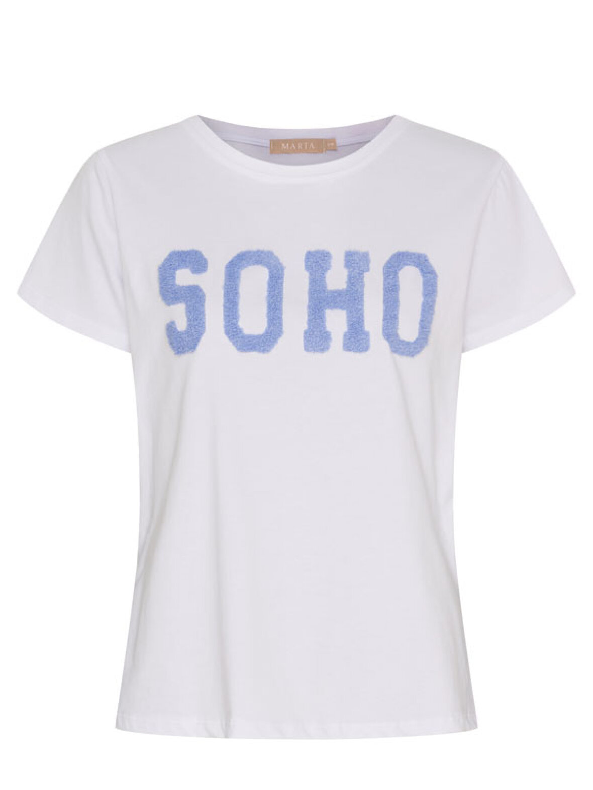 Lækker og moderne T-shirt i klassisk hvid med stort SOHO-statement på fronten i flot blå frotté. Den bløde bomuldskvalitet blandet med elastan giver en virkelig behagelig pasform, som gør T-shirten perfekt til både hverdagsbrug og sporty outfits. Et friskt og cool element til garderoben, der er nemt at style med jeans, joggers eller shorts.