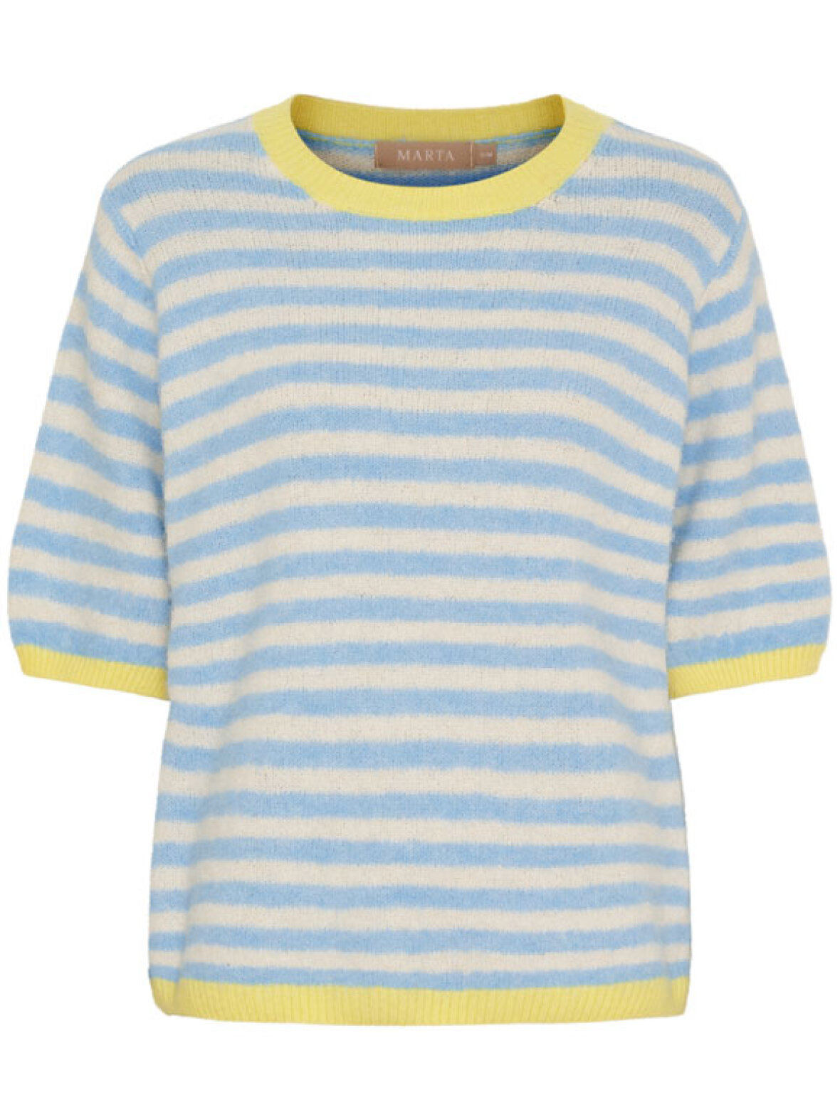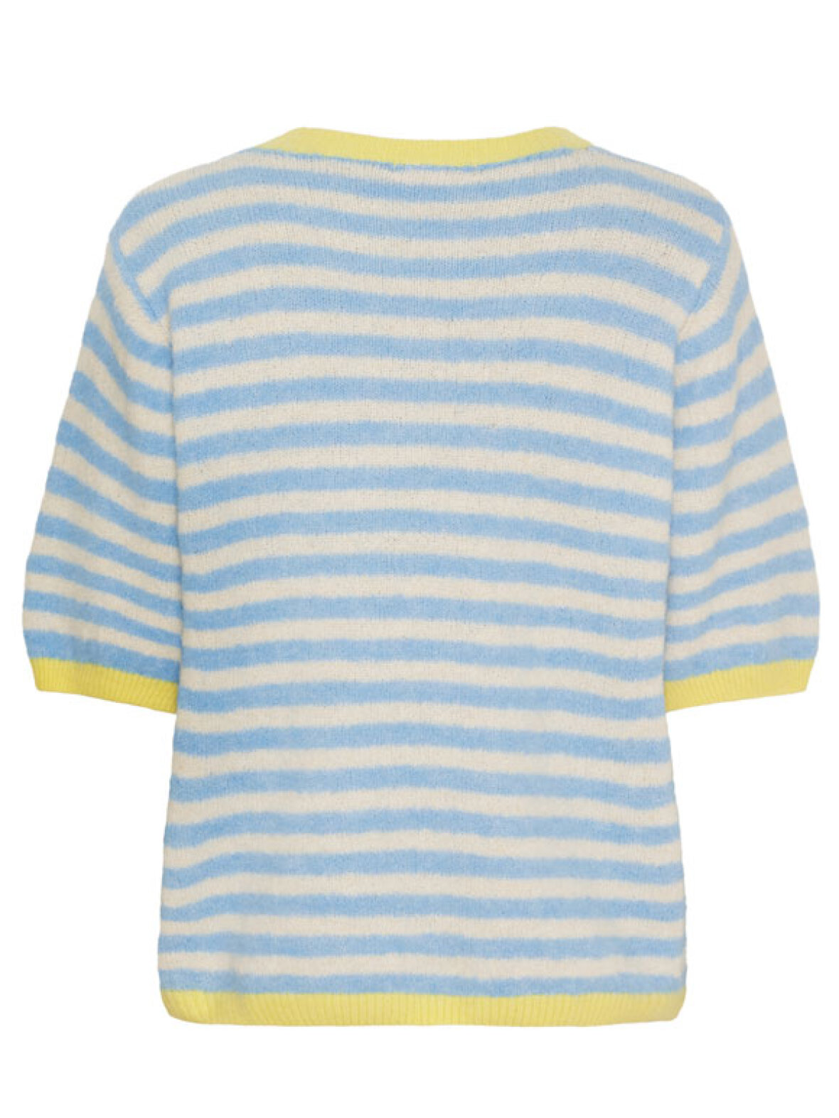 Skøn stribet strik i lyseblå, blå, creme og hvide nuancer, der giver et friskt og feminint udtryk. Strikken har korte ærmer og fine gule ribkanter ved hals og ærmer, som giver et moderne farvespil. Den bløde og lette kvalitet gør den perfekt til både forårs- og sommerbrug, og pasformen er dejligt rummelig uden at virke oversize. En oplagt hverdagsfavorit, der er nem at style til både jeans og nederdele.