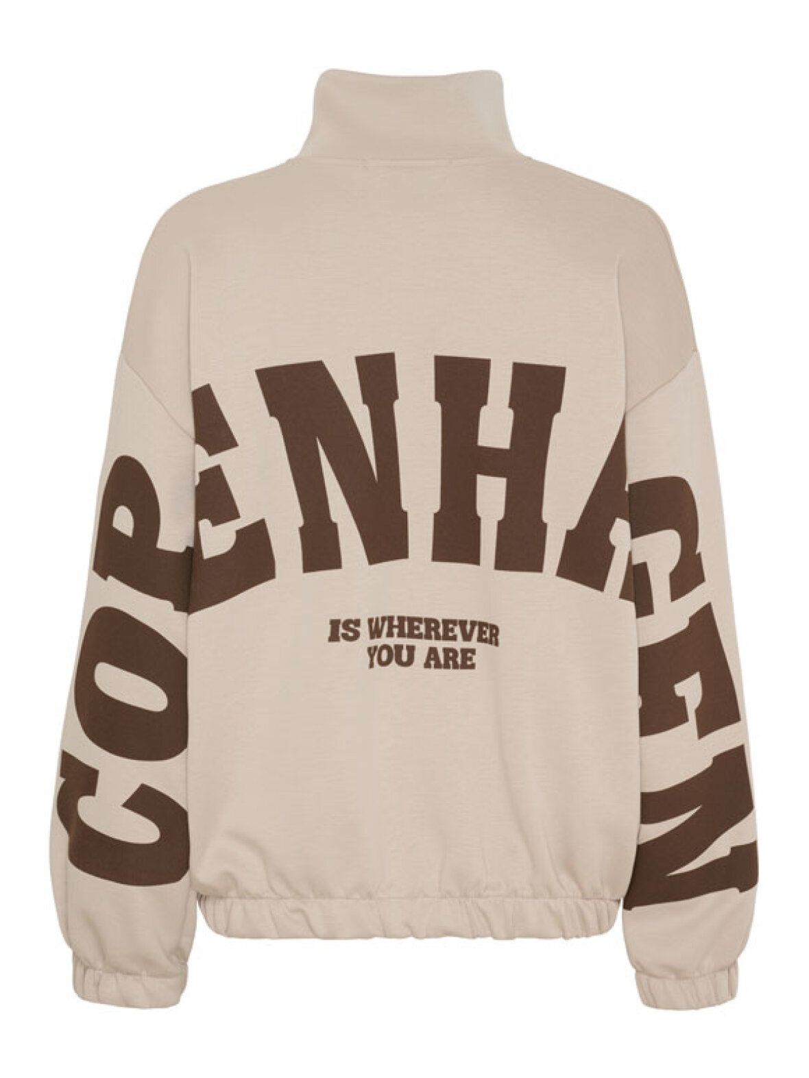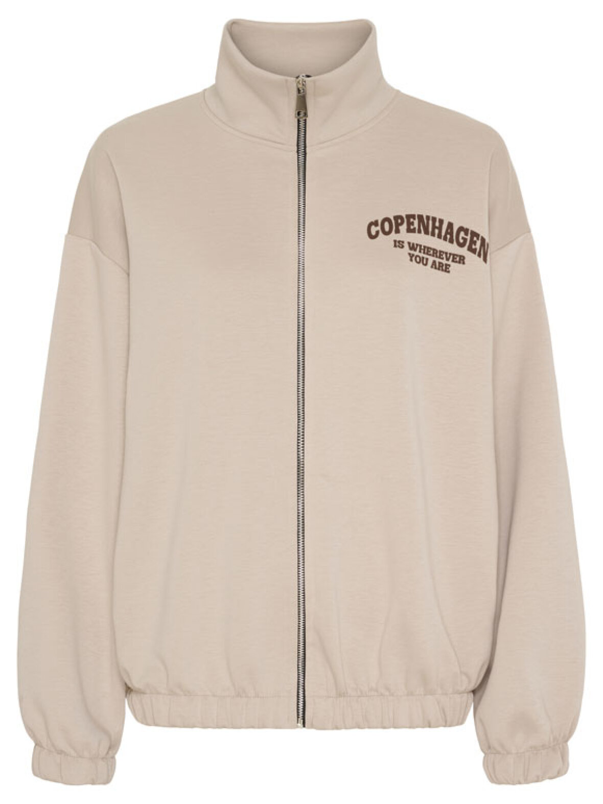 Cool og afslappet sweat-cardigan fra Marta Du Château i en skøn sandfarve. Cardiganen har en høj krave, gennemgående lynlås og elastik ved både talje og ærmer, som giver et komfortabelt og sporty fit. Det grafiske Copenhagen print på både bryst, ærmer og ryg tilfører et moderne og urbant udtryk. Perfekt til afslappede hverdagslooks, gåture og casual layering.