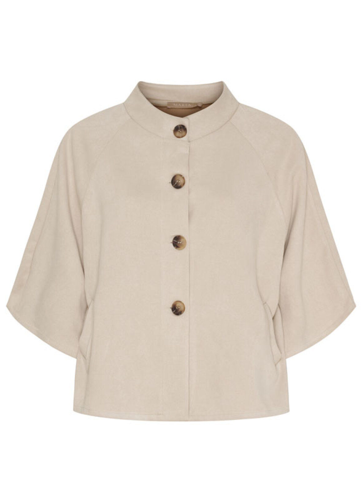 Elegant og let jakke fra Marta Du Château i en smuk sand nuance. Jakken har et moderne, boxy snit med korte, vide ærmer, store knapper foran og en flot opstående krave, der giver et eksklusivt og stilrent look. Den bløde kvalitet sikrer behagelig komfort, mens det minimalistiske design gør den perfekt til både hverdag og pænere anledninger. Brug den som et smart lag til foråret eller som en stilfuld overgangsjakke.