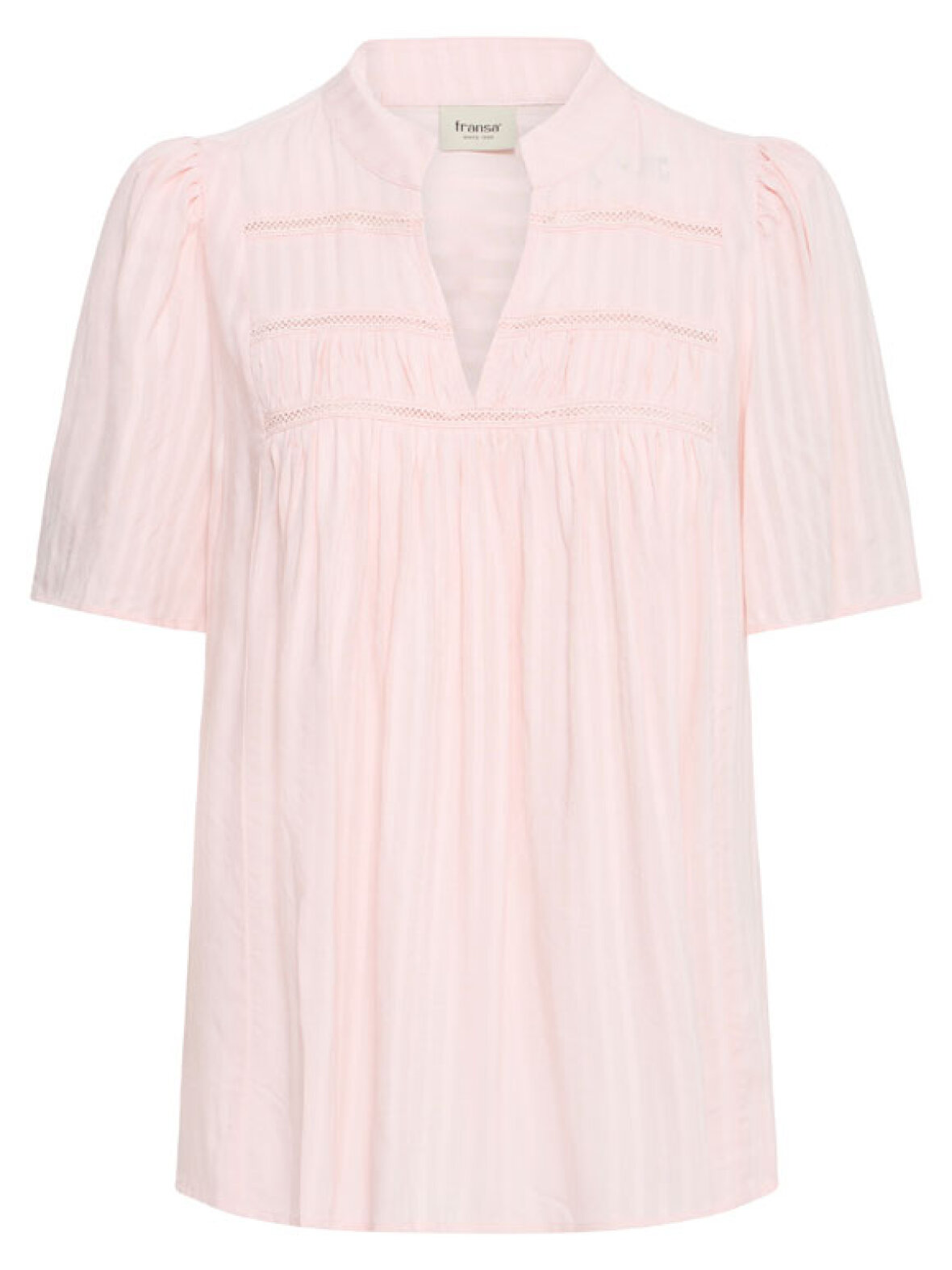 FRVillia-blusen fra Fransa kommer her i en smuk, sart lyserød nuance, der giver et feminint og let udtryk. Den vævede stribe-effekt og de fine blondedetaljer skaber et elegant look, mens den bløde viskose gør blusen luftig og komfortabel at have på.
