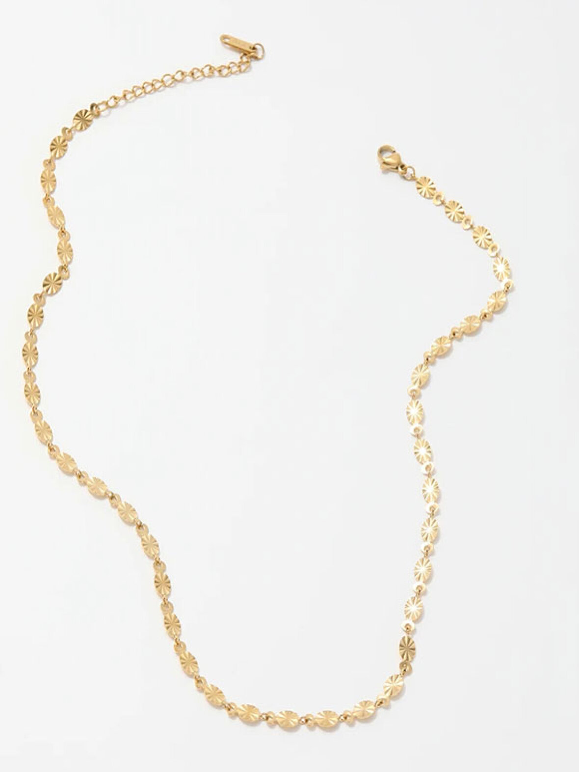H021 Burst Dot er en elegant og detaljeret halskæde designet med små, udskårne burst-formede led, der fanger lyset og giver et smukt, glimtende udtryk. Den guldbelagte finish gør kæden både feminin og eksklusiv – perfekt alene eller som en del af et smukt layering-look. En tidløs favorit til både hverdag og fest.