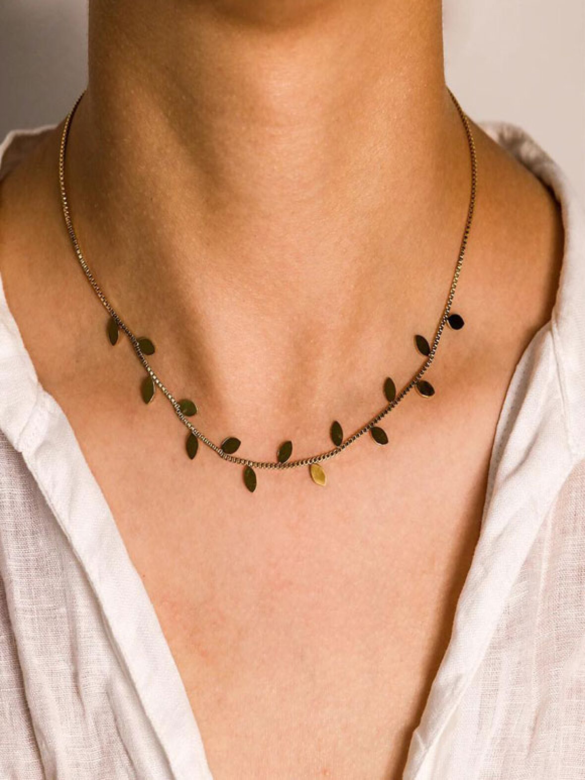 Alora-halskæden er en feminin og let designet kæde med små bladformede vedhæng, der skaber et elegant og naturligt udtryk. De små blade falder smukt langs halsen og giver kæden et delikat, organisk look – perfekt alene for et minimalistisk udtryk eller i lag med andre halskæder for et mere personligt stylingudtryk.