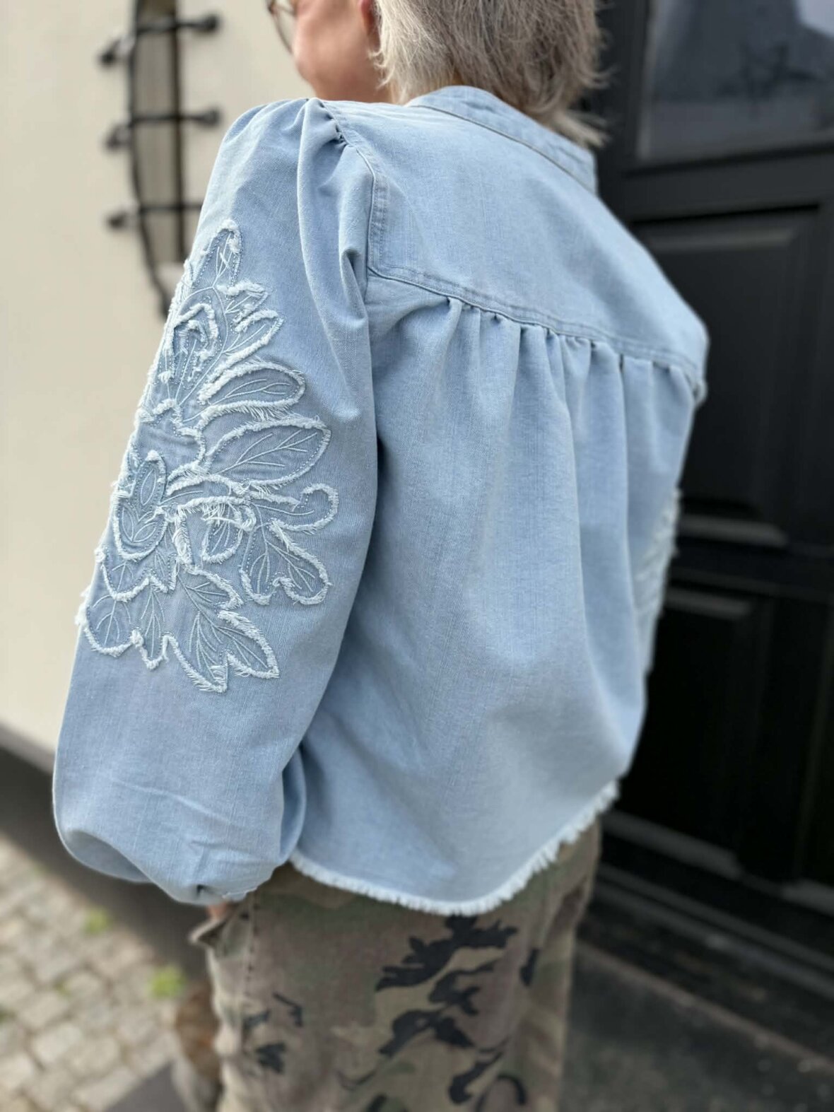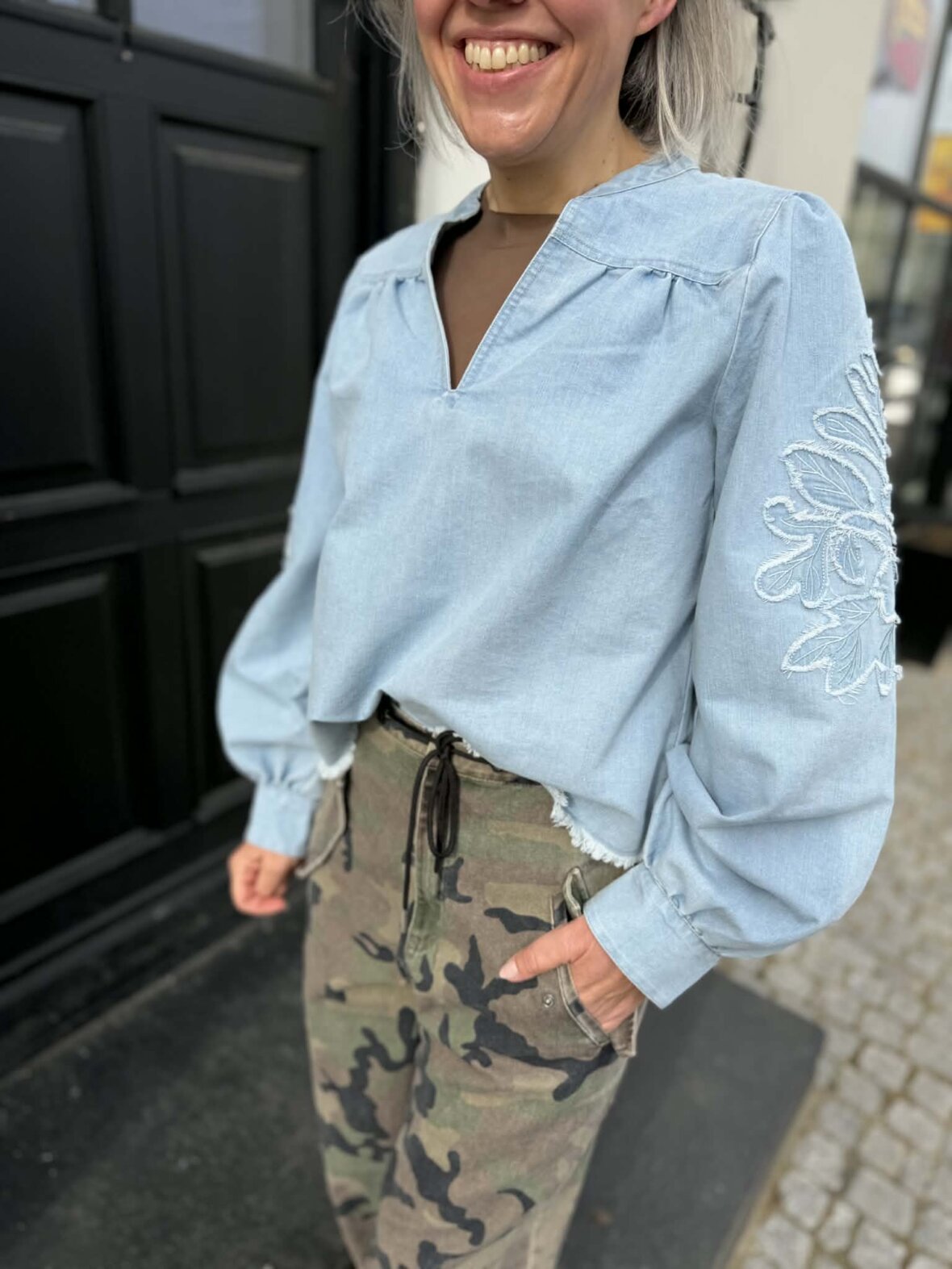Smuk denimbluse fra Gossia i let lyseblå vask. Blusen har broderede blomsterdetaljer på ærmerne, som giver et feminint og eksklusivt look. Den V-formede halsudskæring skaber et flot fald, og den rå frynsekant i bunden giver et afslappet, moderne udtryk. En pullover-model uden lukning, nem at style til både bukser, nederdele og shorts.