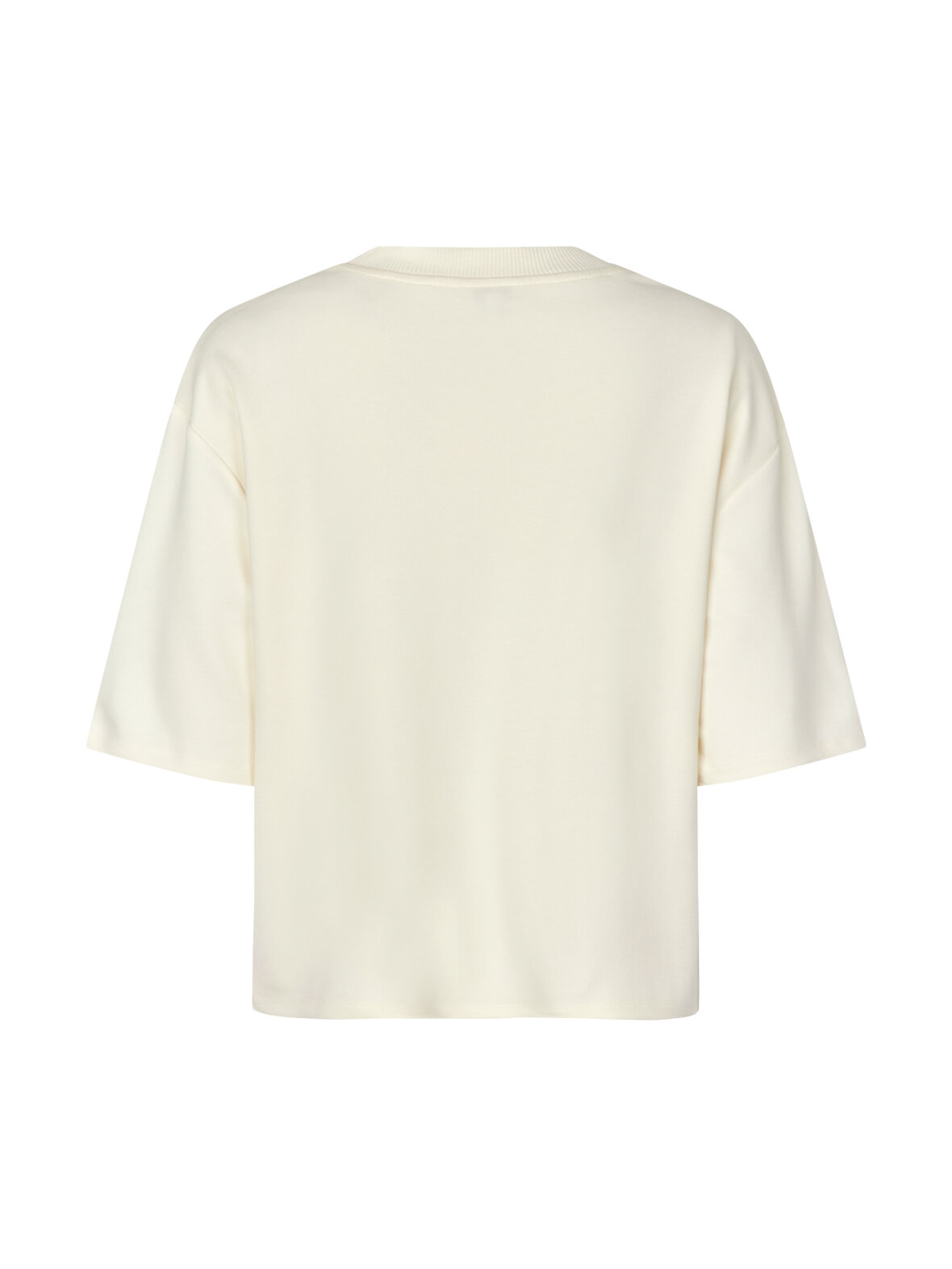 En lækker basis t-shirt i en smuk off white nuance – et must-have i garderoben, når looket skal være enkelt, stilrent og komfortabelt. Den bløde kvalitet med viskoseblanding giver en glat og behagelig følelse mod huden, samtidig med at elastan sikrer fleksibilitet og en flot pasform.