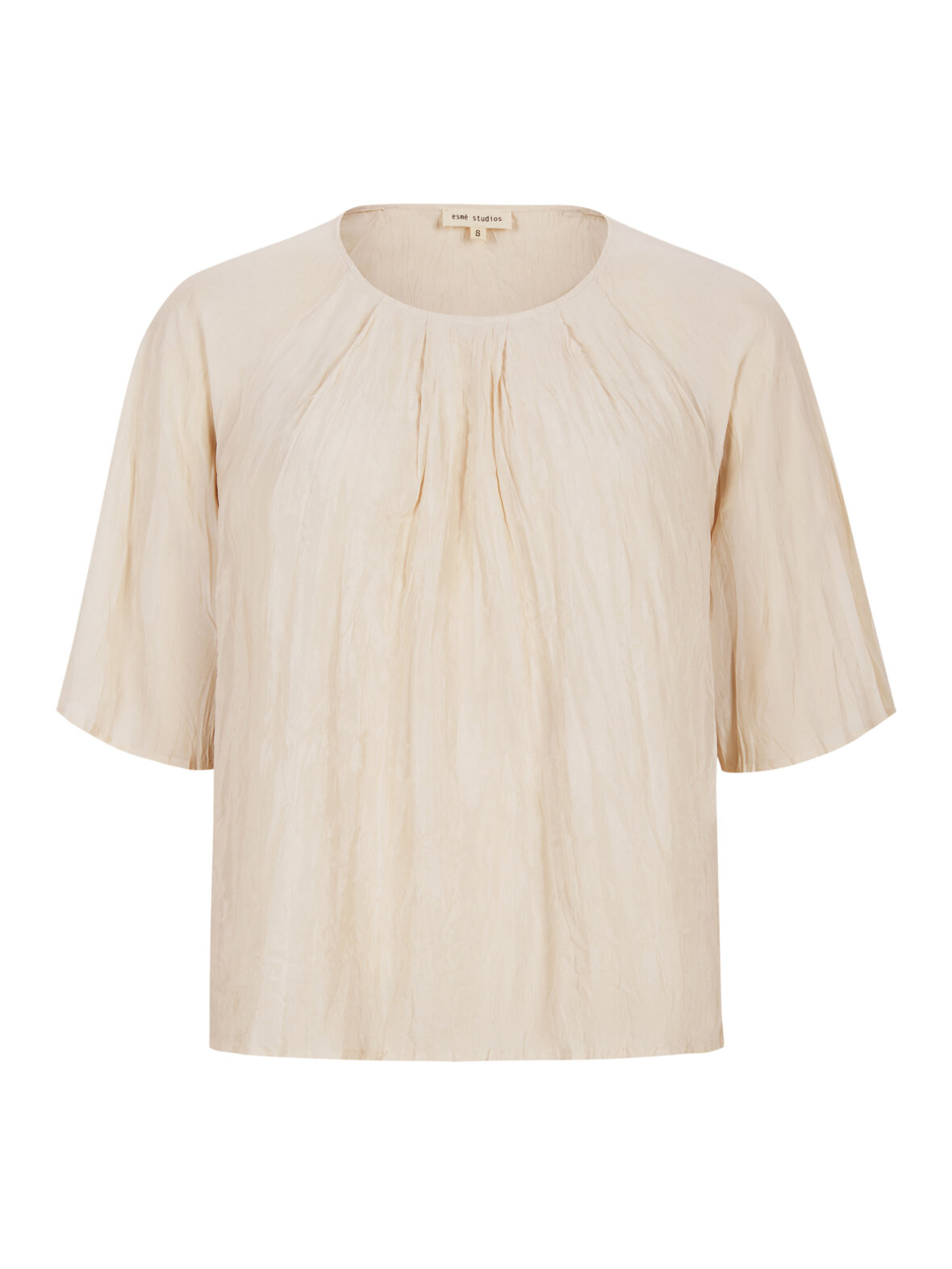 En smuk og let sandfarvet bluse fra Esmé Studios, designet i et elegant, krøllet look, der giver et naturligt og moderne udtryk. Blusen er fremstillet i 100% recycled polyester, som gør den både bæredygtig og behagelig at have på. Den runde hals og de bløde folder foran giver et feminint fald, mens de korte raglanærmer skaber en afslappet, stilren pasform – perfekt til både hverdag og finere anledninger.
