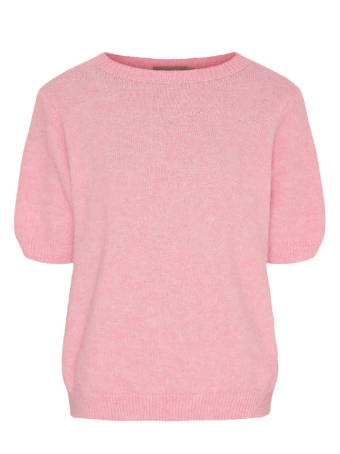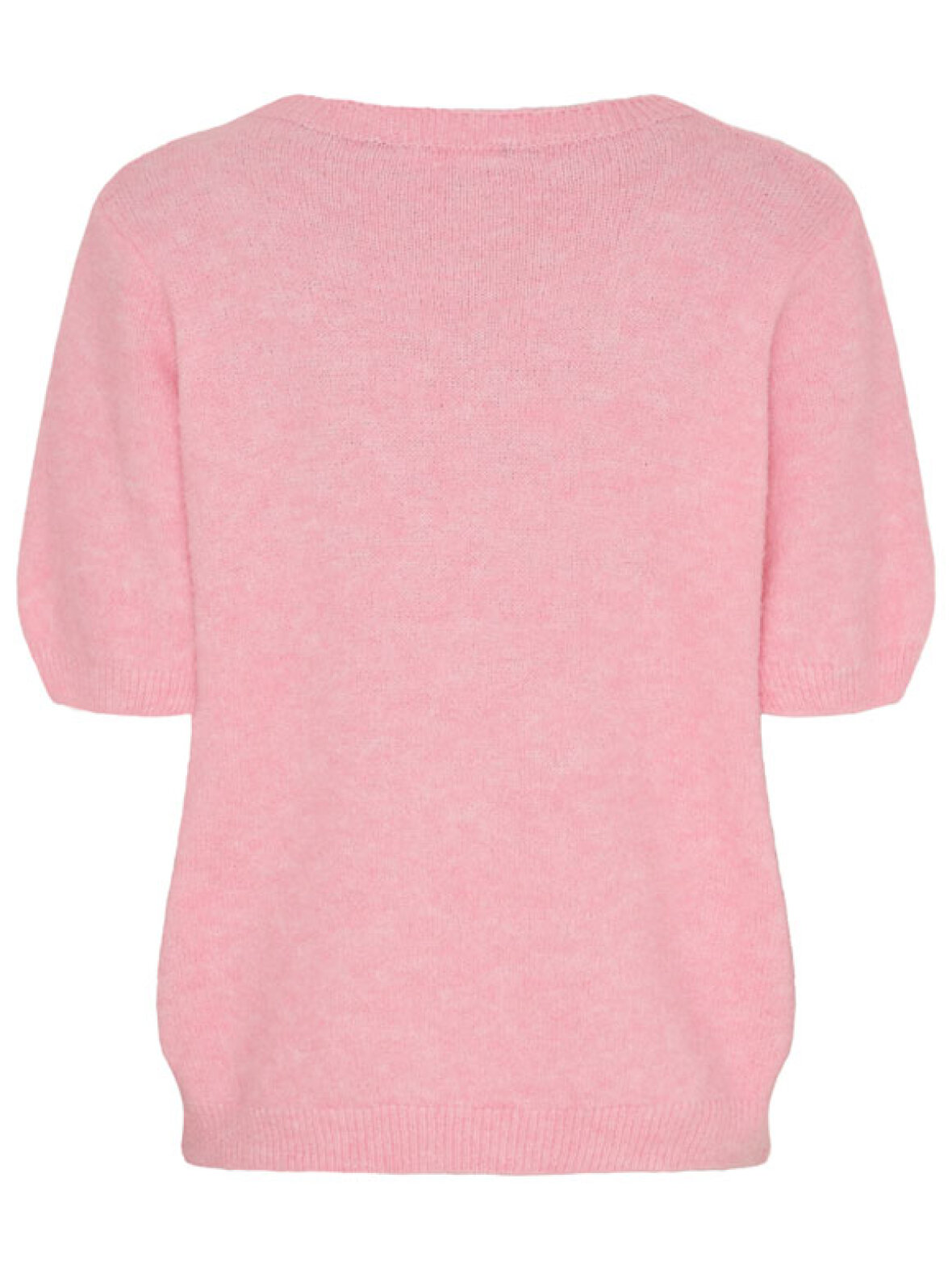 Den fine lyserøde strikbluse har korte ærmer og en klassisk rund hals, hvilket giver et stilrent look, der nemt kan styles med både jeans, nederdel eller over en skjorte. Brug den alene i de mildere måneder eller sammen med en skjorte eller blazer på køligere dage.