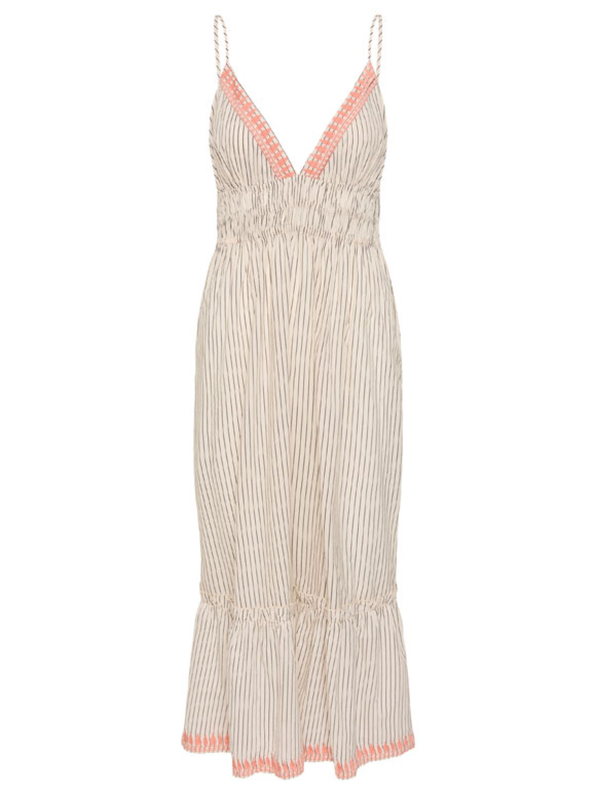 RevelinaSZ kjolen fra Saint Tropez er designet i en smuk off white nuance med fine, diskrete striber og feminine detaljer i en varm koralfarve. Den dybe V-udskæring og de smalle stropper giver et elegant og sommerligt look, mens den elastiske talje skaber en flatterende silhuet.