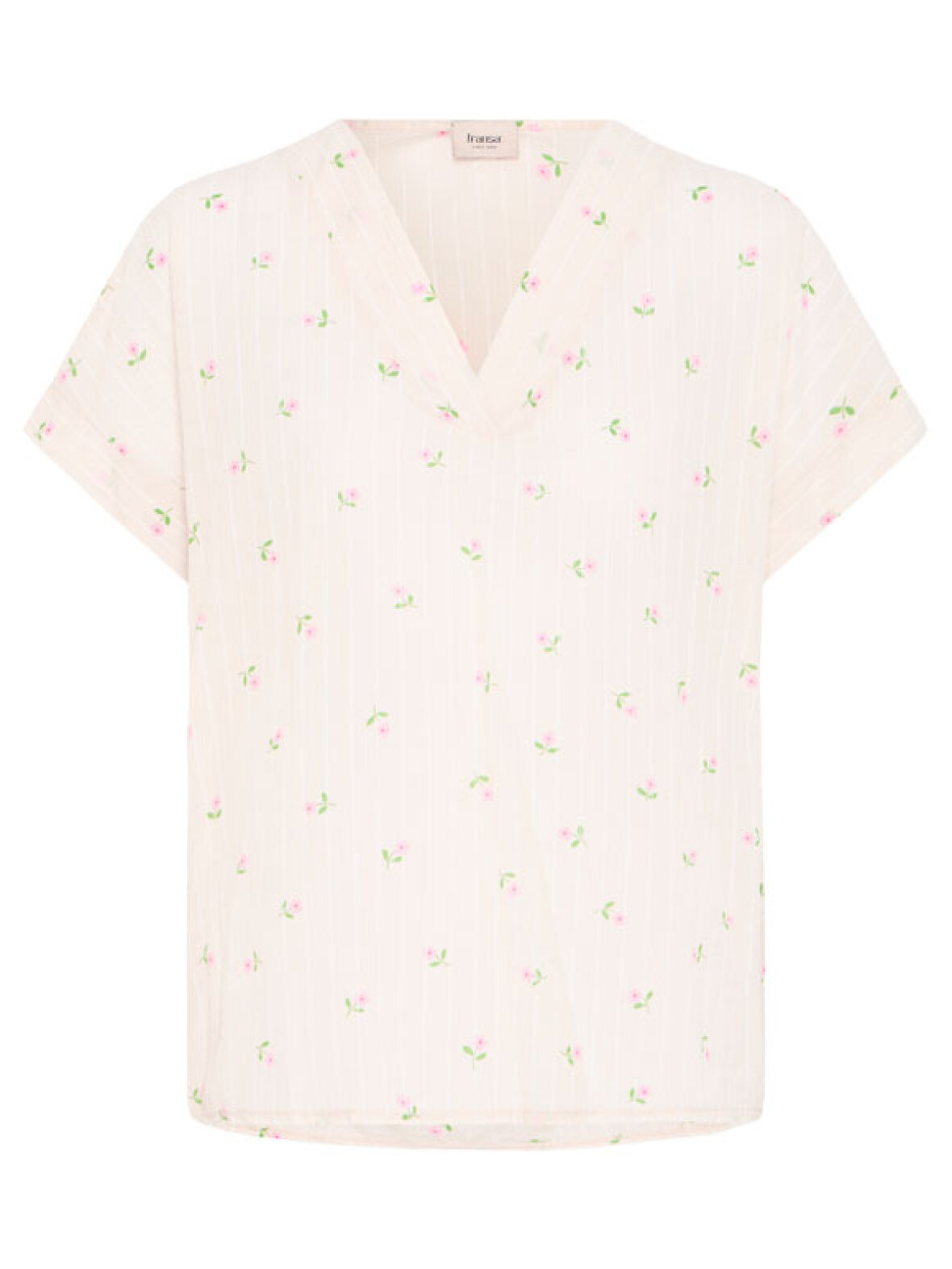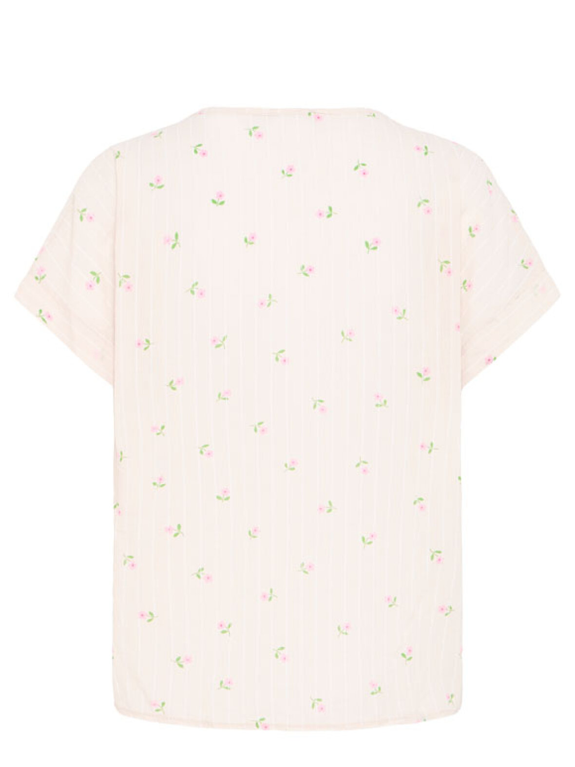 FRJulietta blusen fra Fransa er den perfekte kombination af komfort og fine detaljer. Den smukke cremefarvede bund med små rosa blomster giver et blødt og romantisk udtryk, der passer perfekt ind i både hverdag og sommergarderobe.