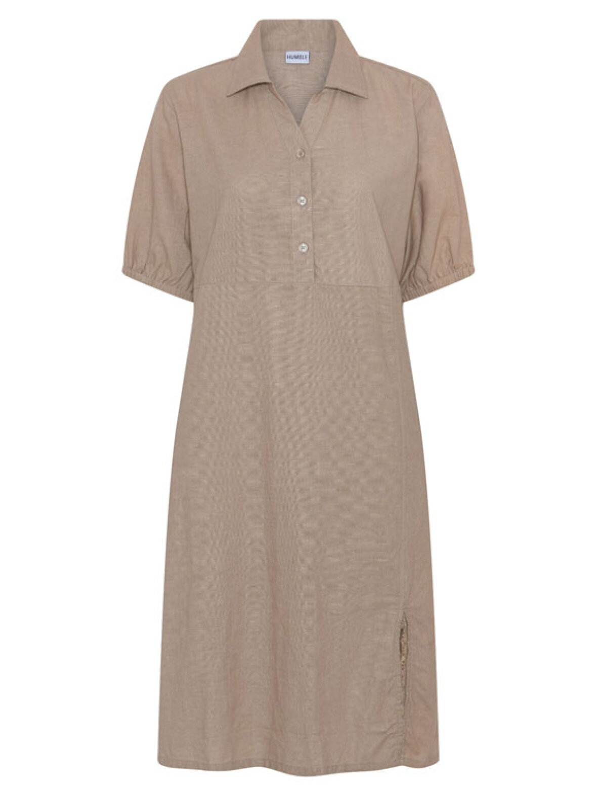 Denne smukke Humble by Sofie kjole i sandfarve er et perfekt valg til en stilren og afslappet garderobe. Det lette linen-look giver et naturligt og eksklusivt udtryk, mens de fine flare-detaljer skaber en feminin og bevægelig silhuet.