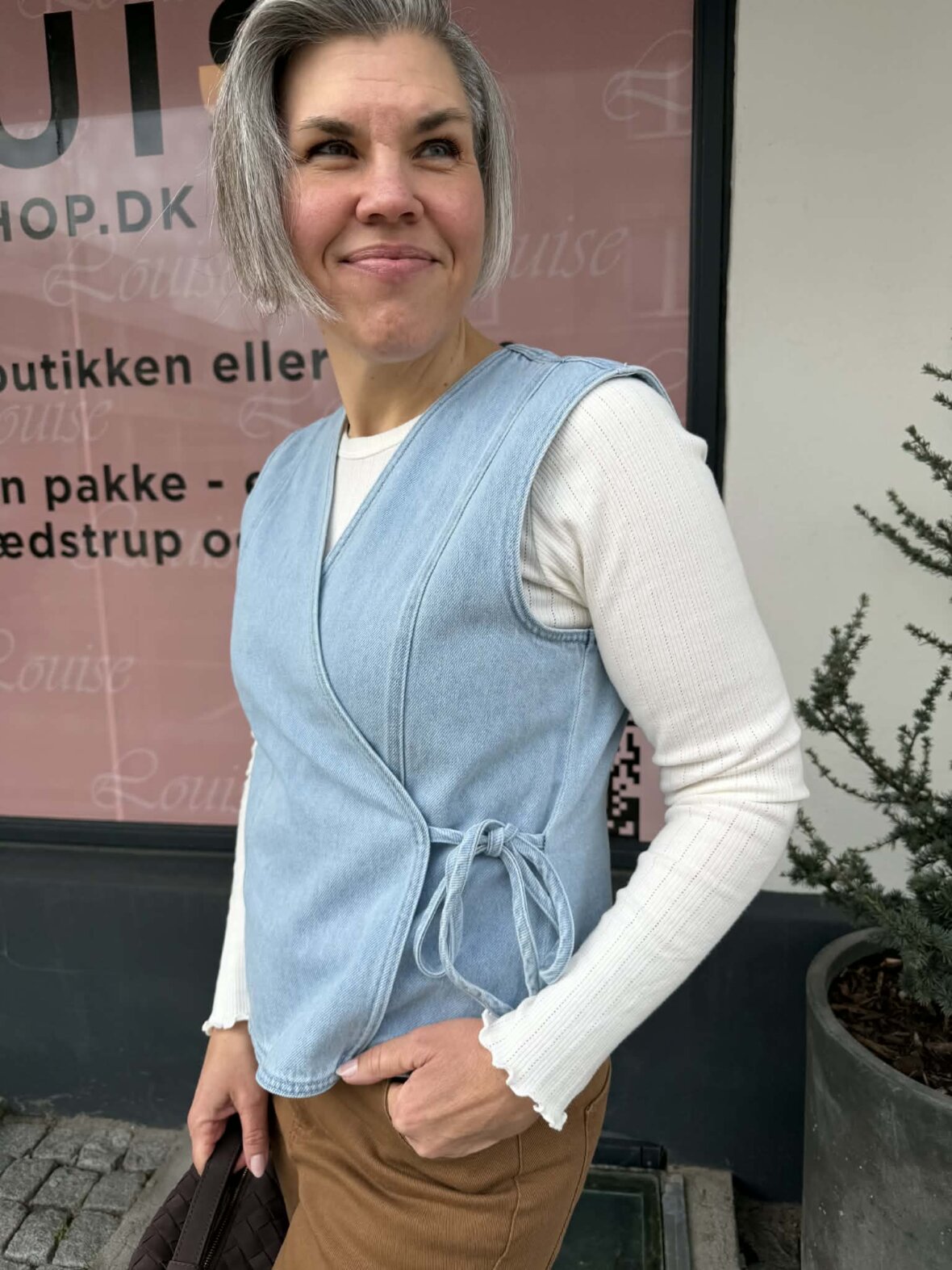 Cenaya SL-M vesten er et musthave til dig, der elsker et afslappet, men stadig feminint look. Den bløde denim og wrap-effekten med bindebånd i siden giver en smuk silhuet, som nemt kan styles både casual og mere dressed. Perfekt over en strik, skjorte eller kjole – året rundt.