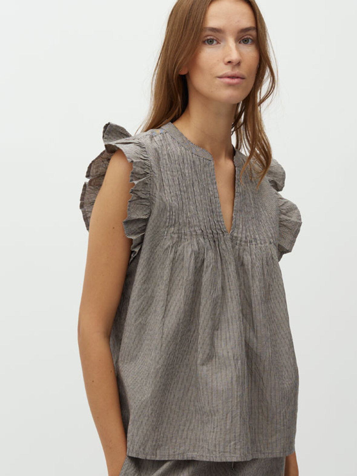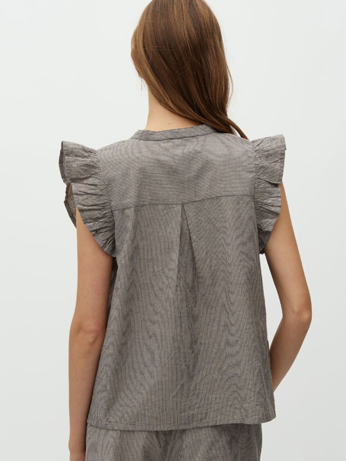 Denne Gemala-M top i brun er et smukt og feminint valg til din garderobe. De elegante flæsedetaljer ved skuldrene giver et let og romantisk udtryk, mens de fine bisser foran tilfører et eksklusivt touch.